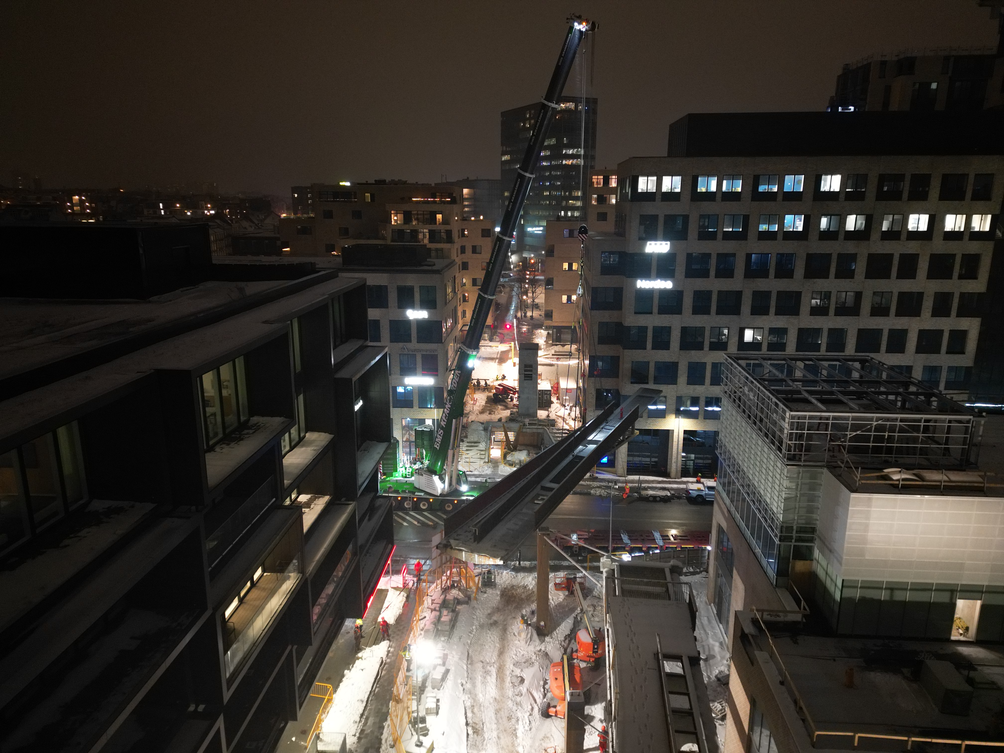 På pladsen stod vores 450 tons mobilkran klar til at løfte sektionen det sidste stykke op i højden og på plads.