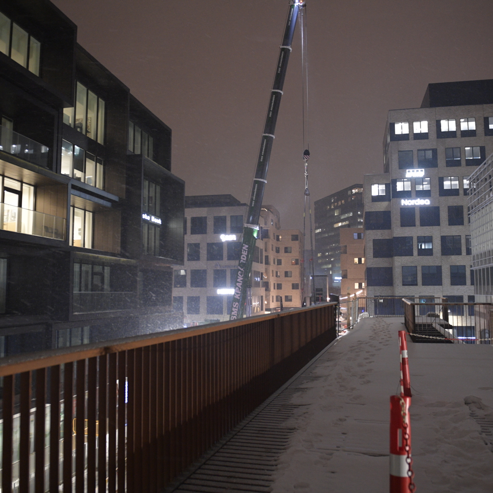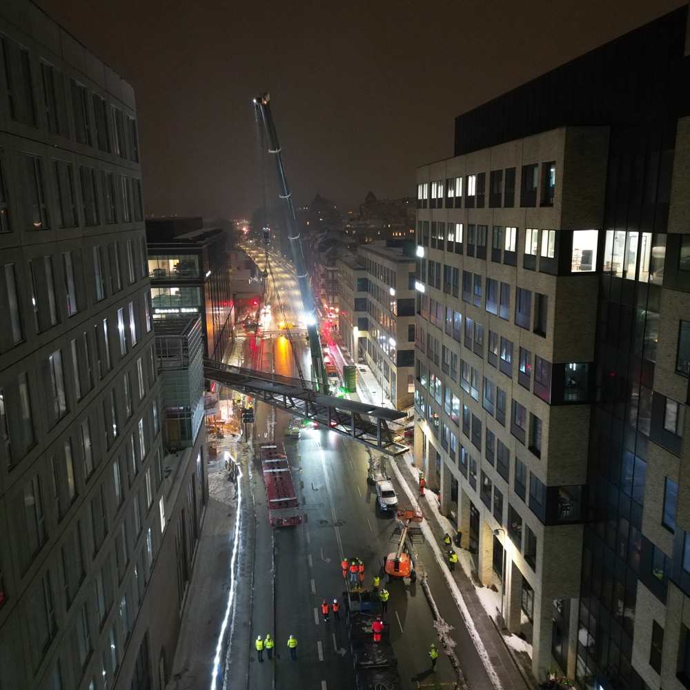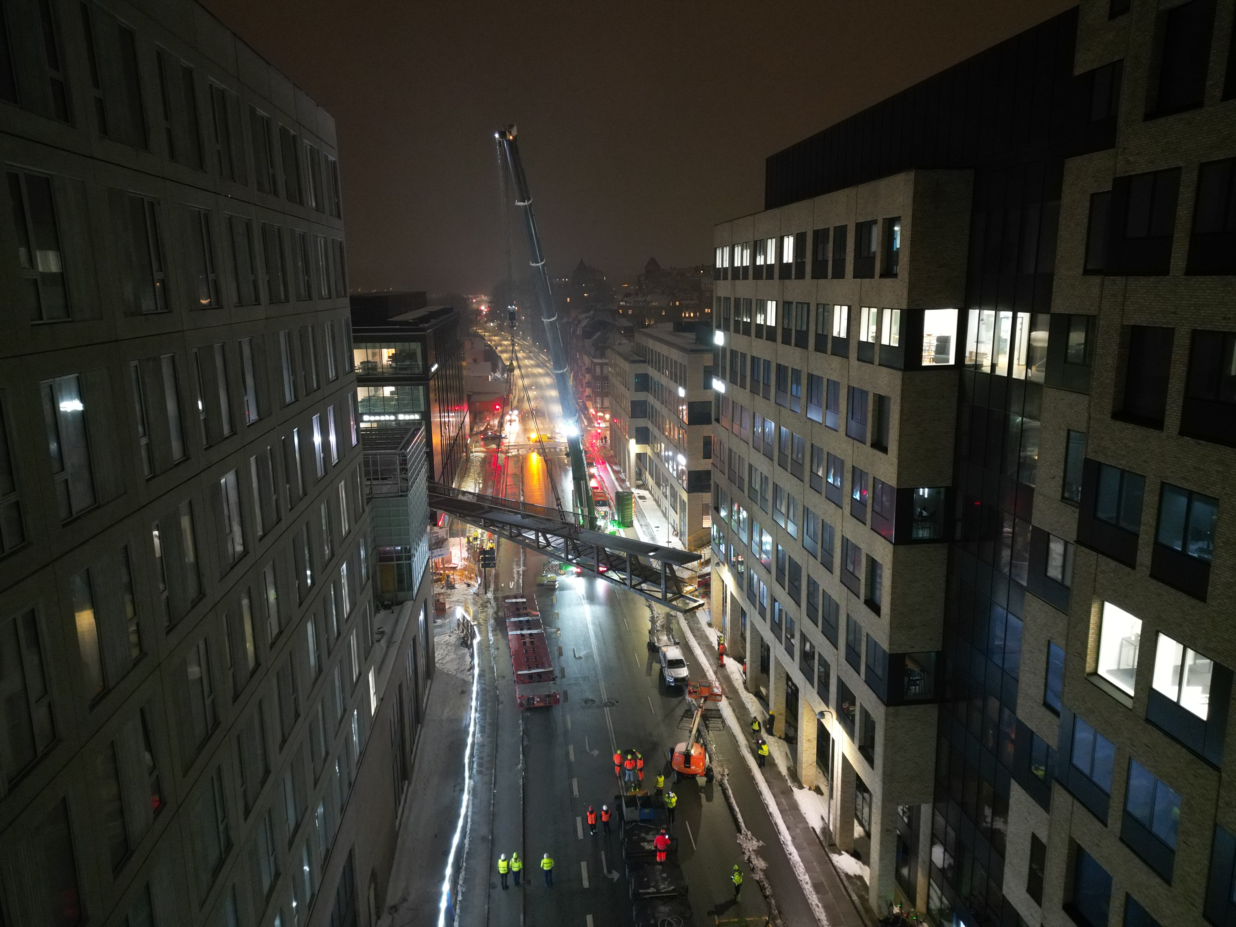 En 57 tons tung brosektion skulle transporteres gennem byen og løftes på plads mellem bygningerne ved Spanien. Opgaven krævede præcis planlægning, tæt samarbejde og det rigtige materiel.