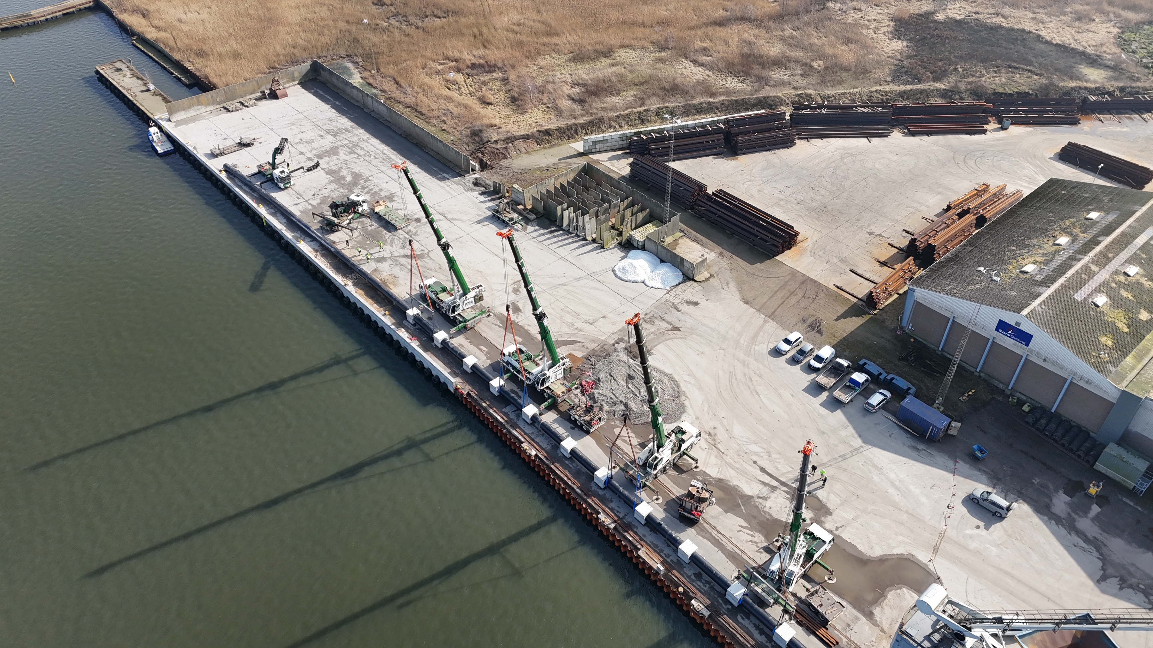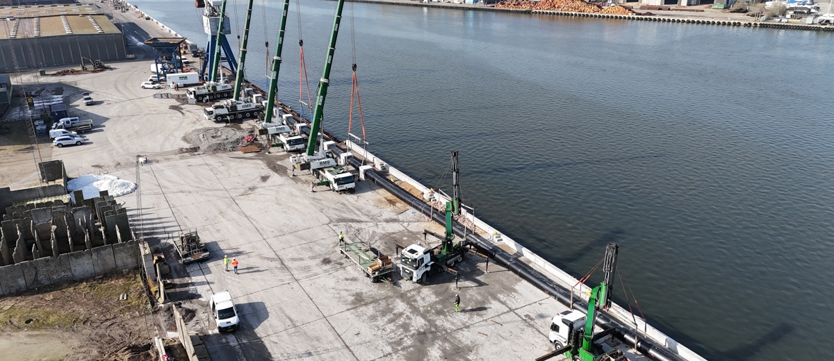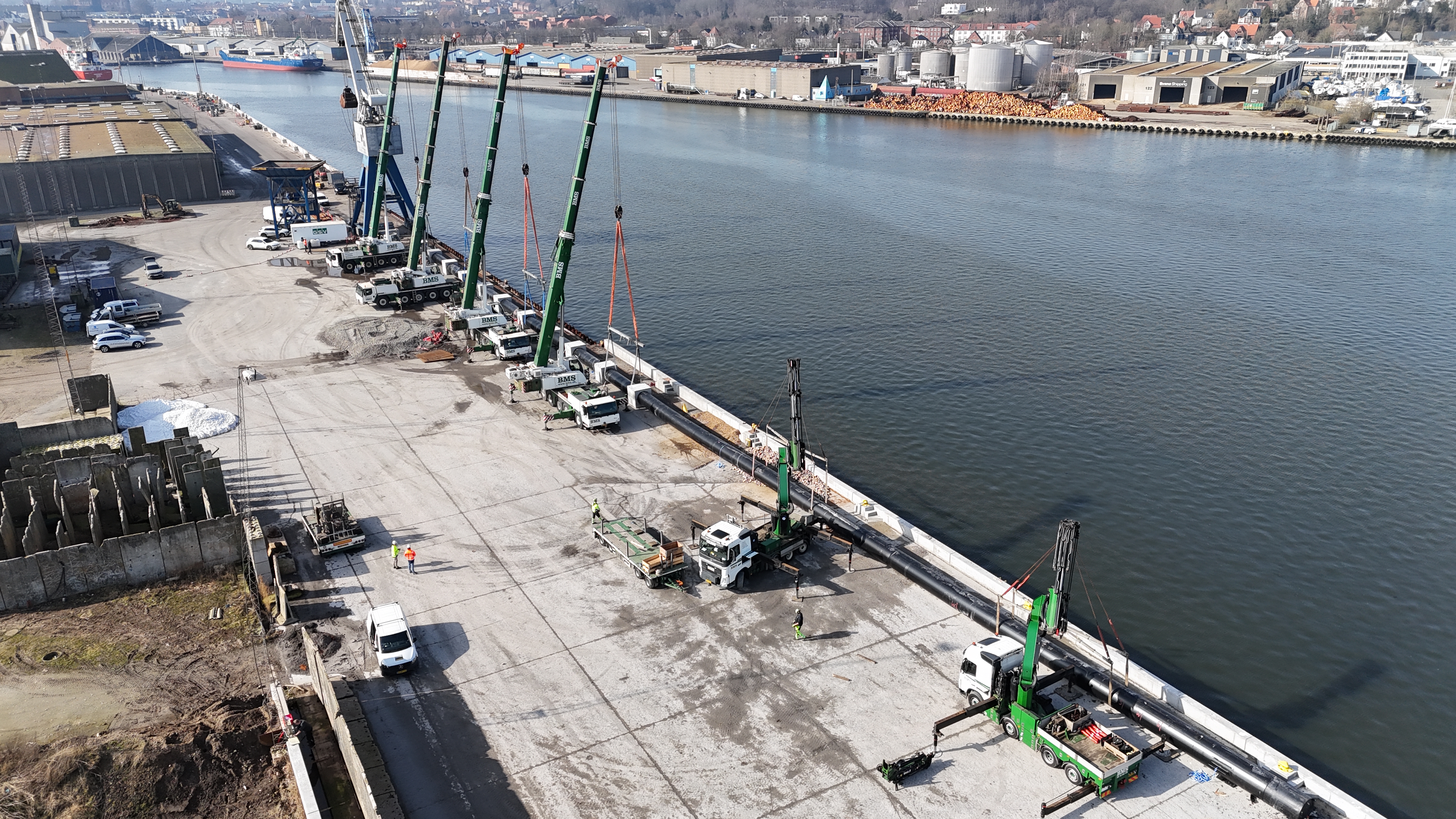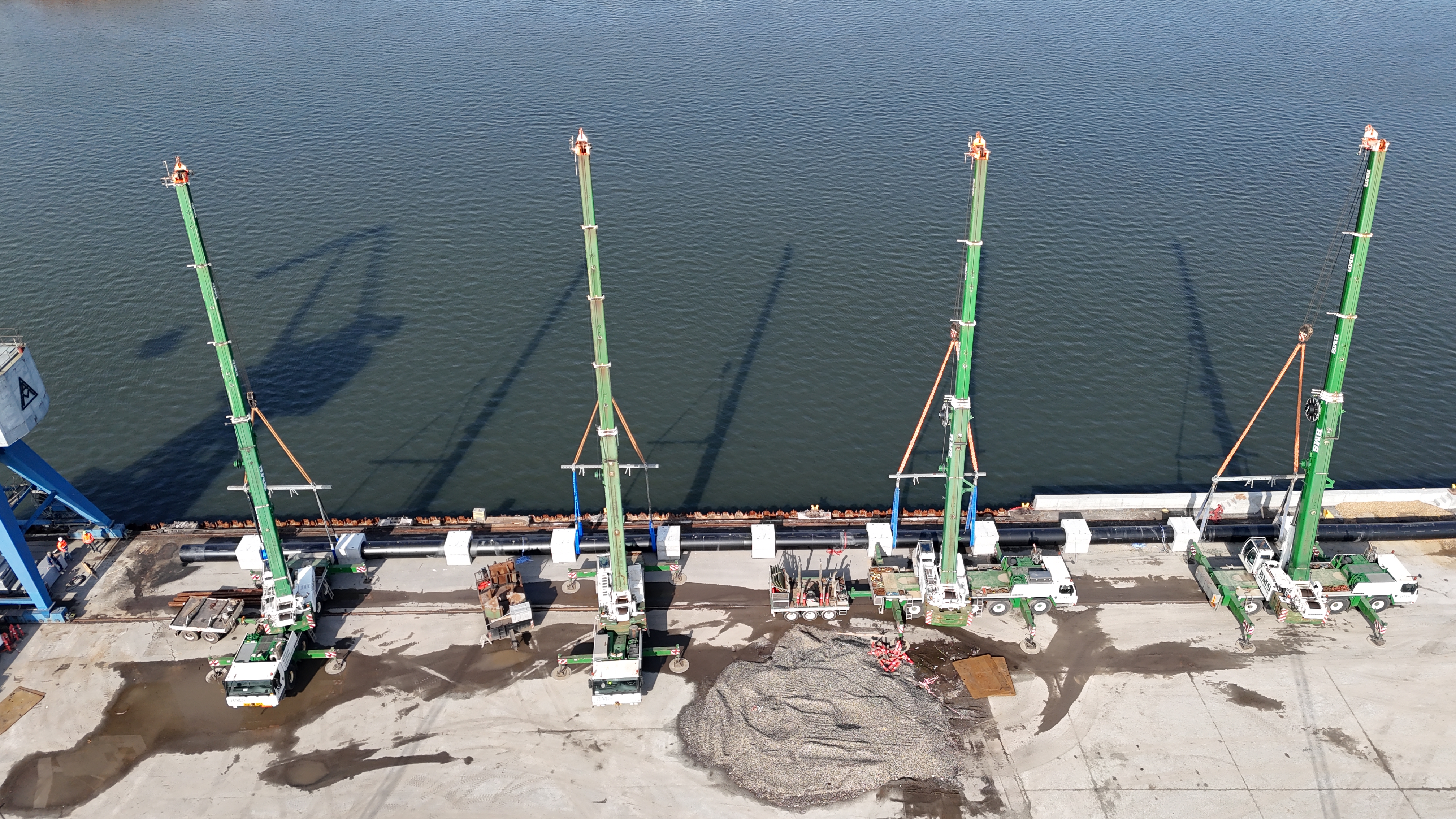 På Kolding Havn blev et 140 meter langt rør løftet på plads i et samløft med seks kraner. Den samlede vægt var 86 ton.