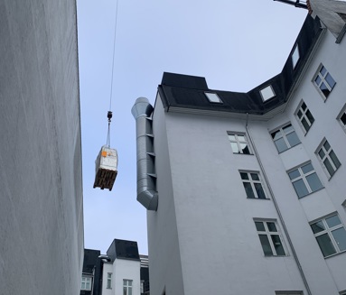 Effektivt løft af 500 kg koblingsanlæg over 22 meter høj bygning i København med 200tm lastbilkran og fly-jip.