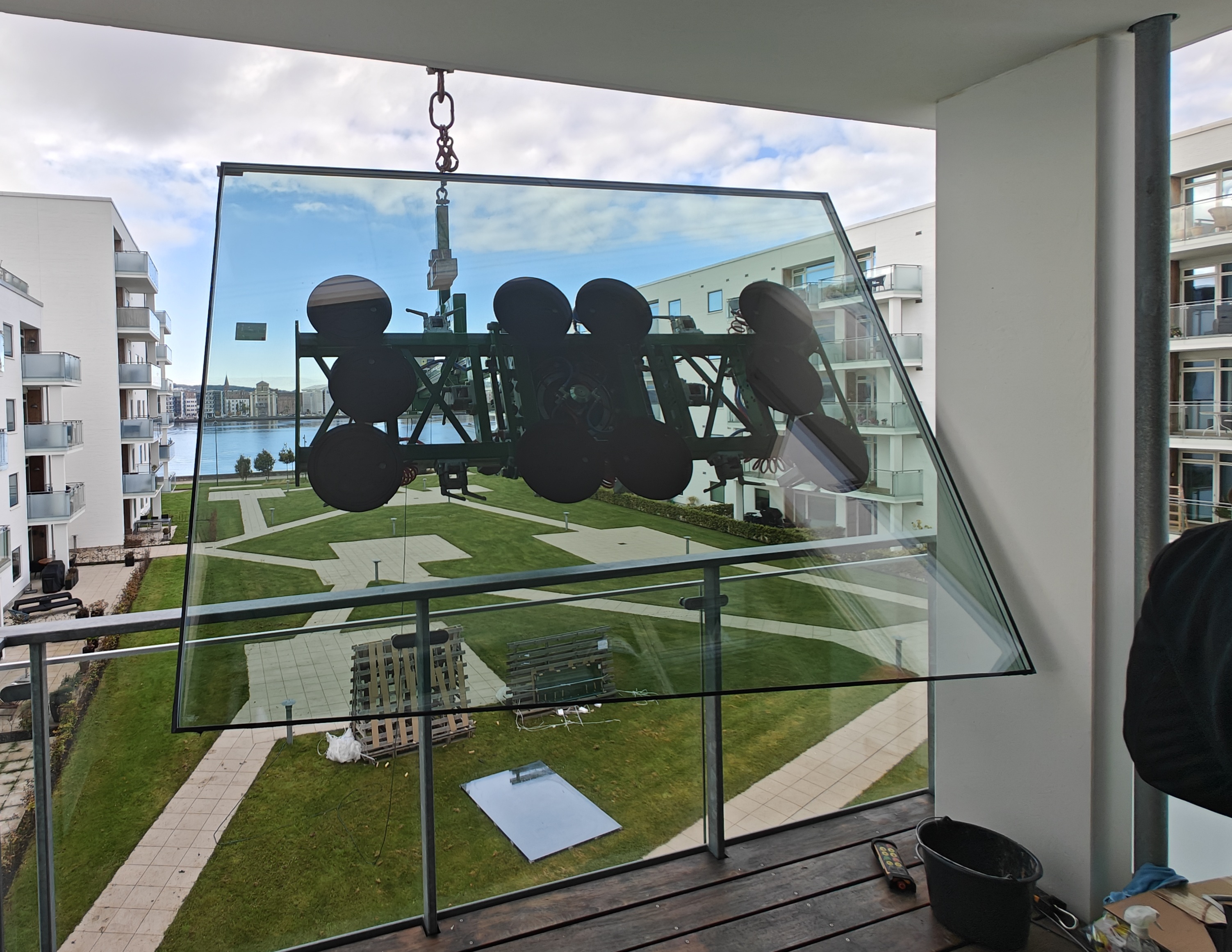 Vi placerede en mobiltårnkran på den modsatte side af bygningen. Med et balanceåg udstyret med glasmanipulator kunne vores team række ind under altanen, vippe glasset over værnet og montere ruderne sikkert på plads.