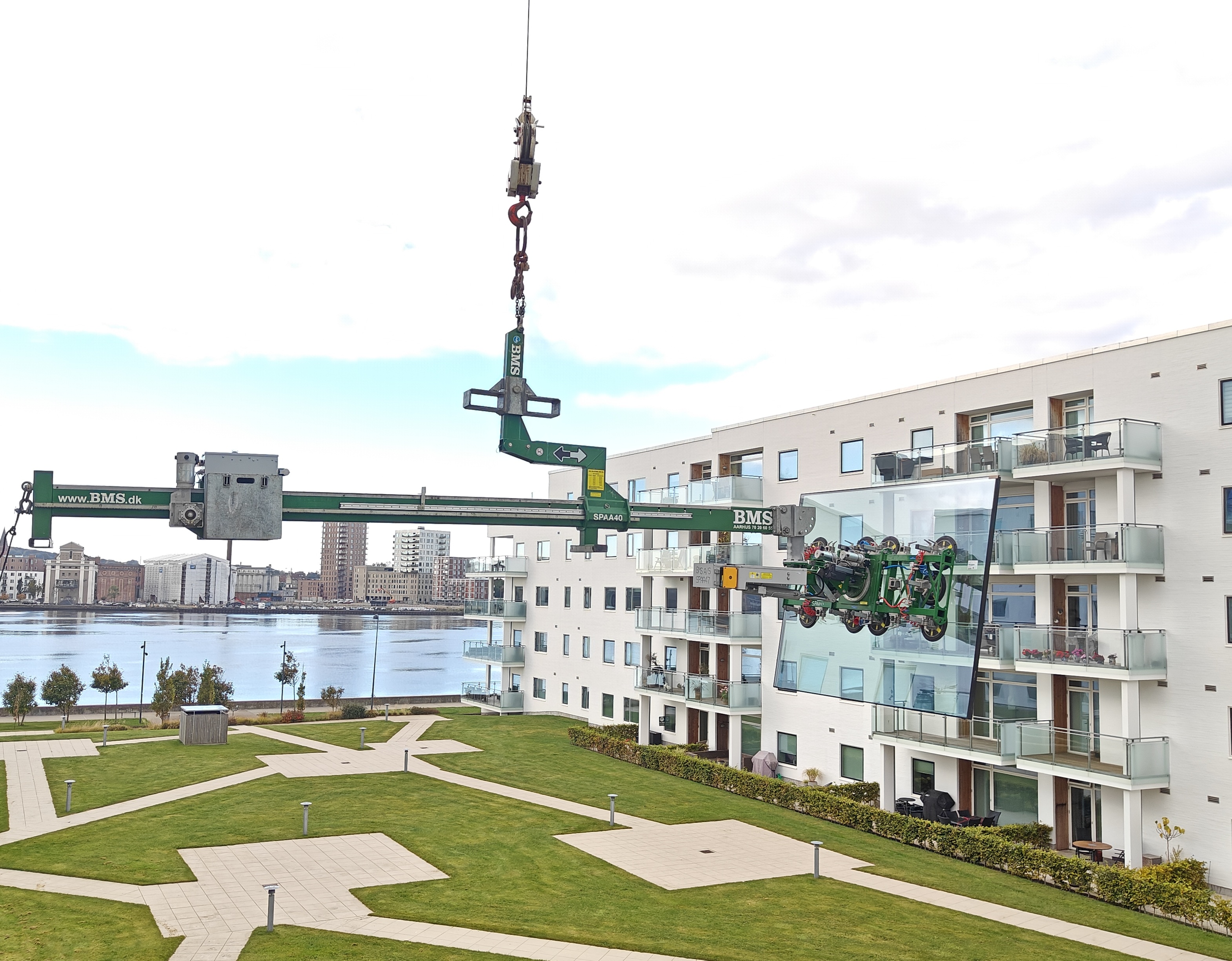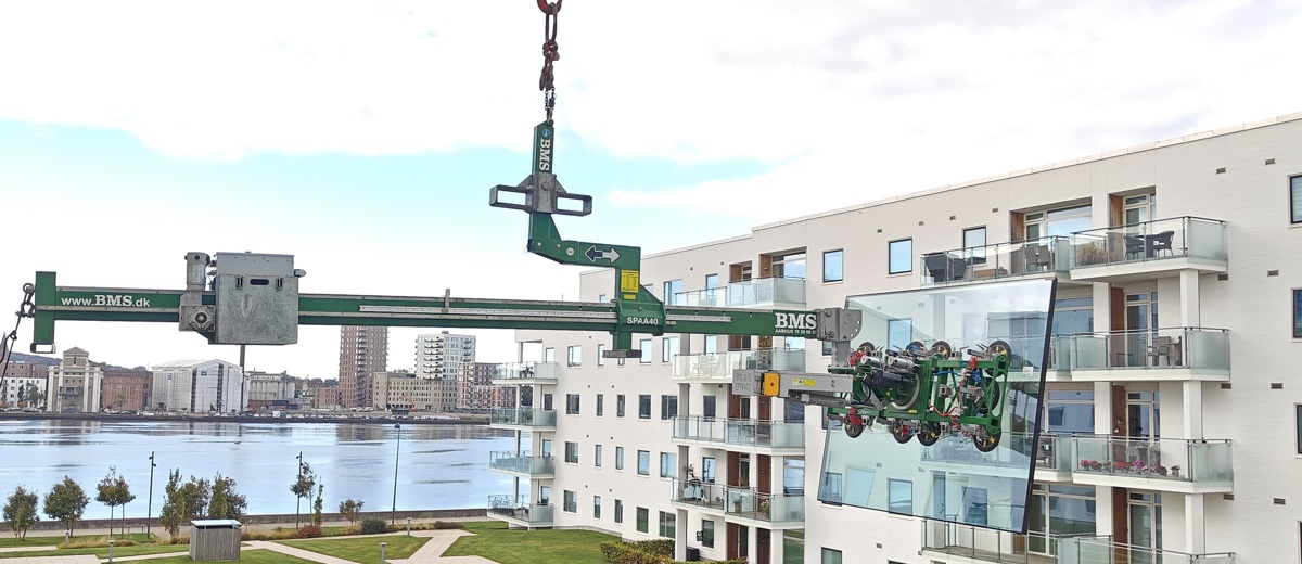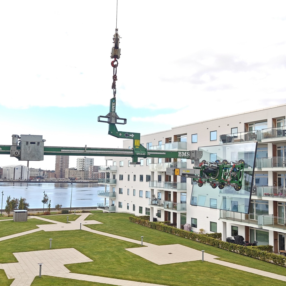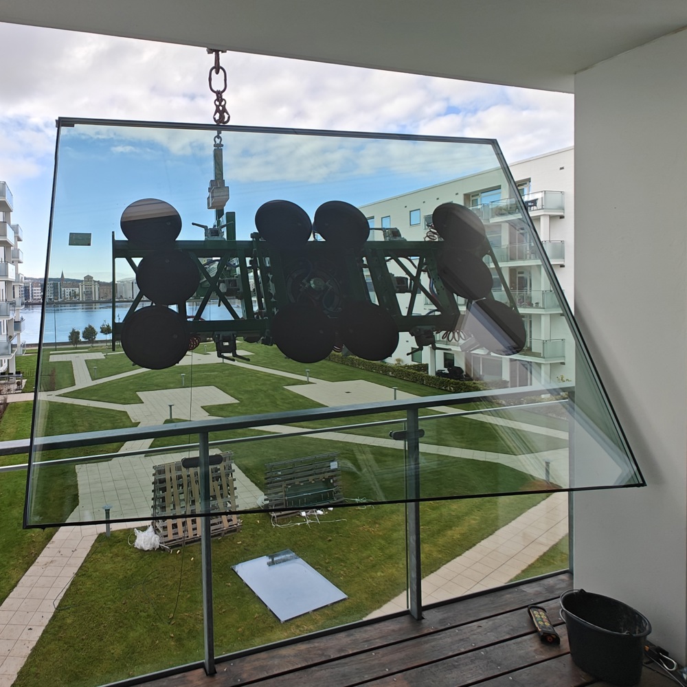 Hos BMS er ingen opgave for trang eller kompleks. For nyligt skulle vi udskifte to store glasruder (2,4 x 2 m, ca. 240 kg) i lejligheder, hvor traditionelle metoder ikke var mulige. Arbejdsområdet var begrænset af altaner, glasværn og manglende kranadgang på grund af parkeringskælder under bygningen.
