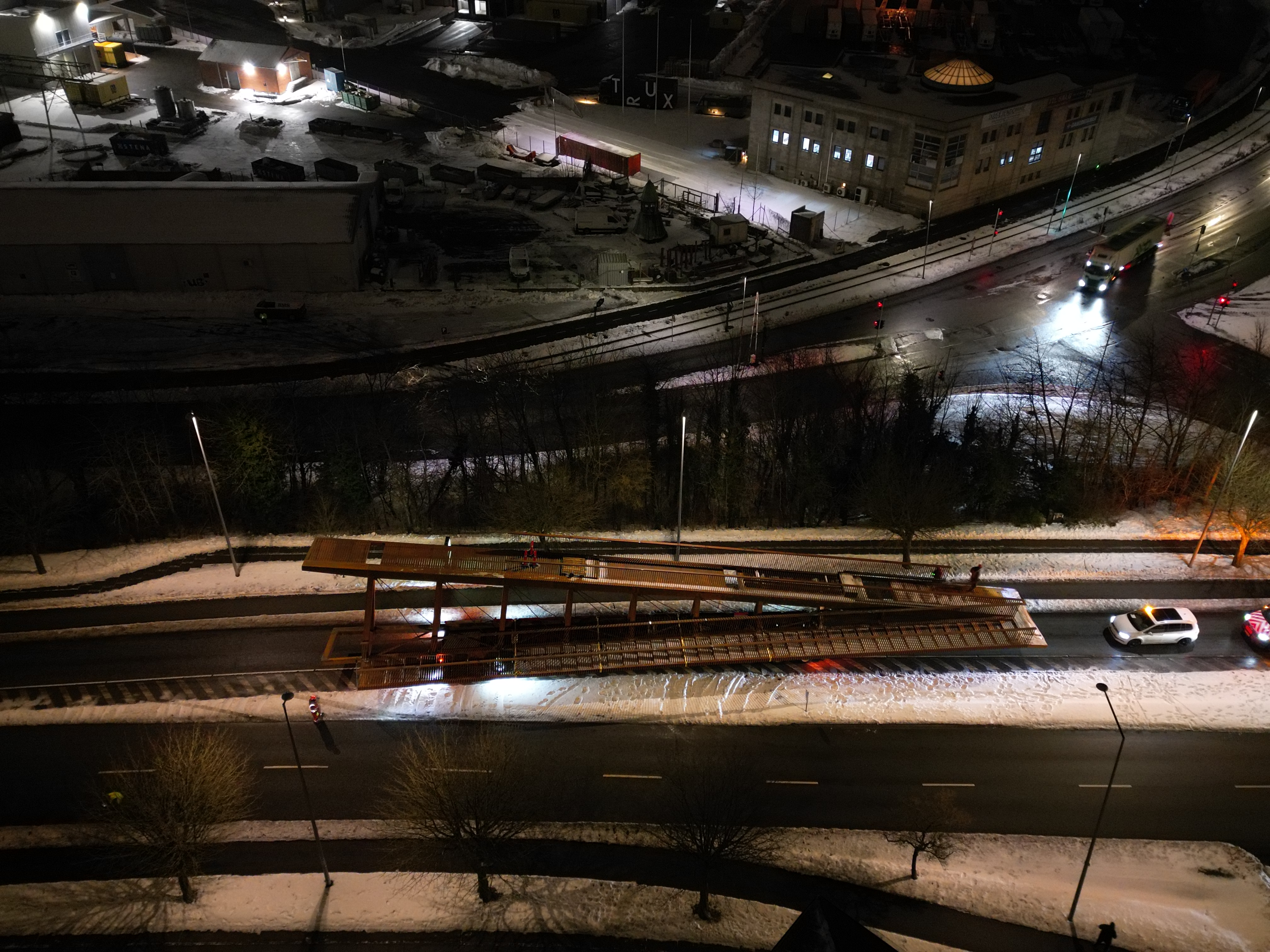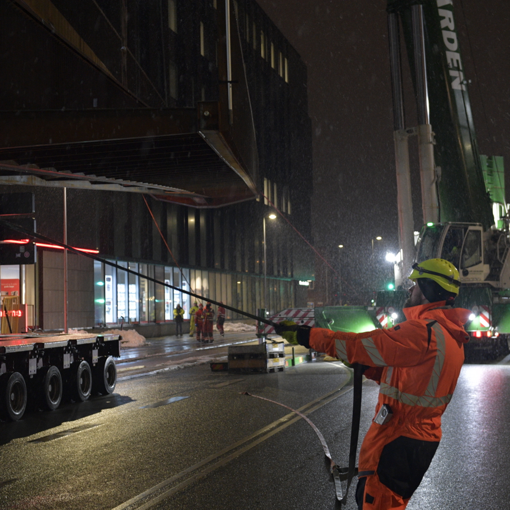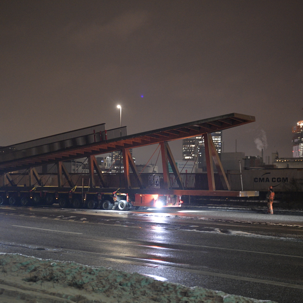 En 57 tons tung brosektion skulle transporteres gennem byen og løftes på plads mellem bygningerne ved Spanien. Opgaven krævede præcis planlægning, tæt samarbejde og det rigtige materiel.