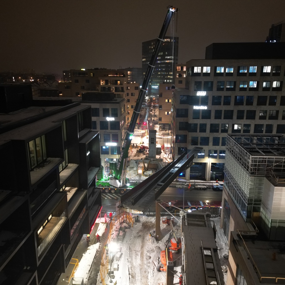 På pladsen stod vores 450 tons mobilkran klar til at løfte sektionen det sidste stykke op i højden og på plads.
