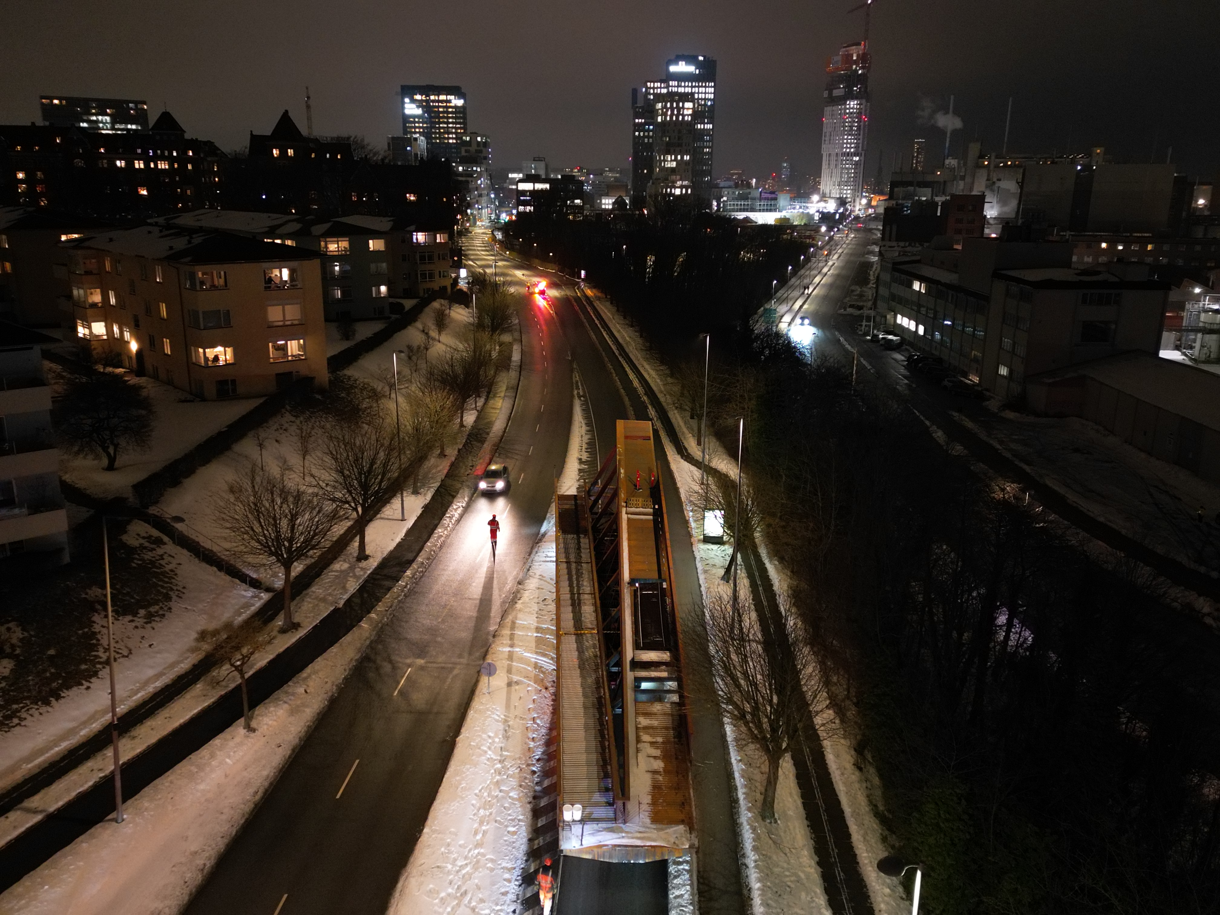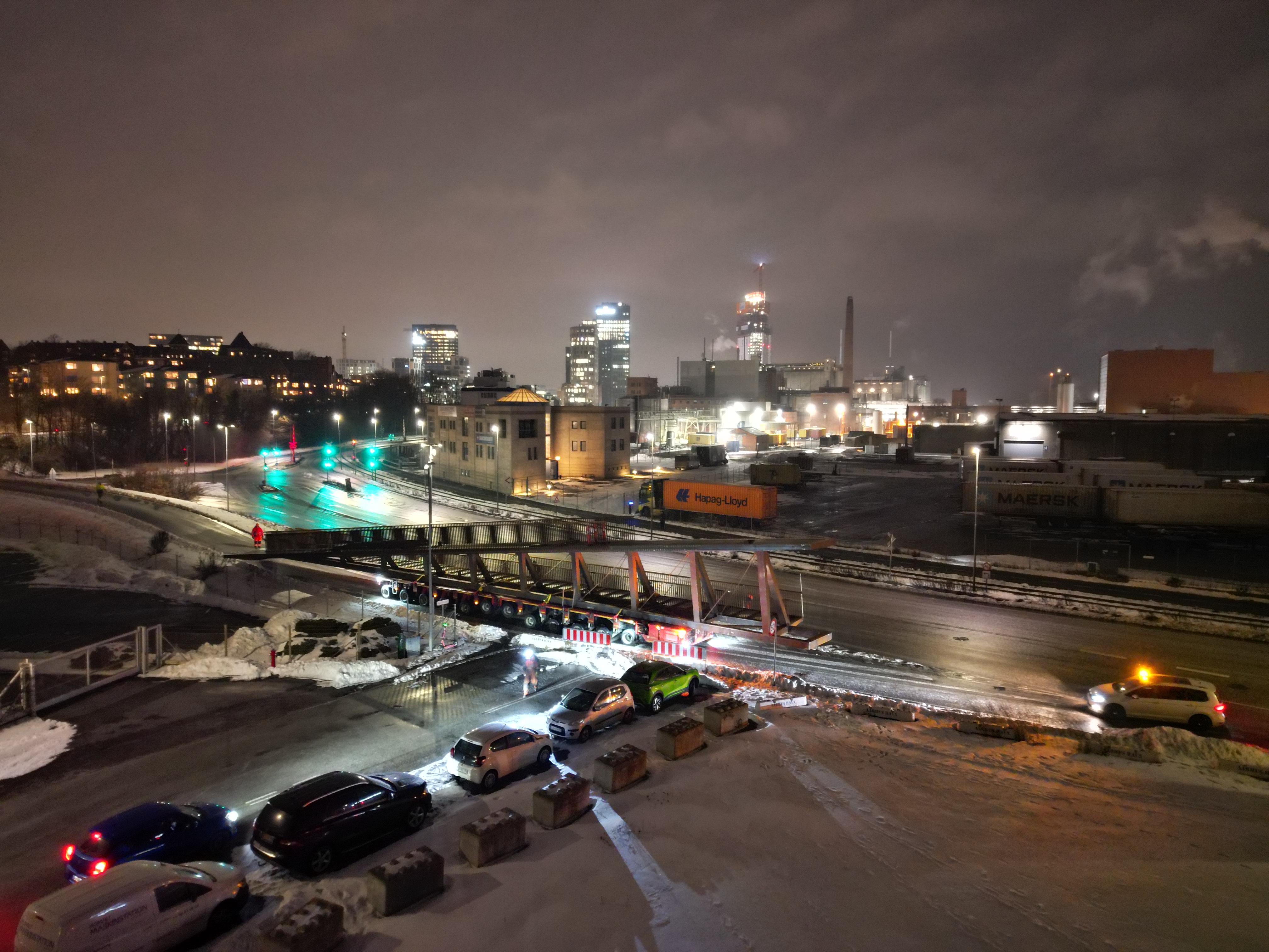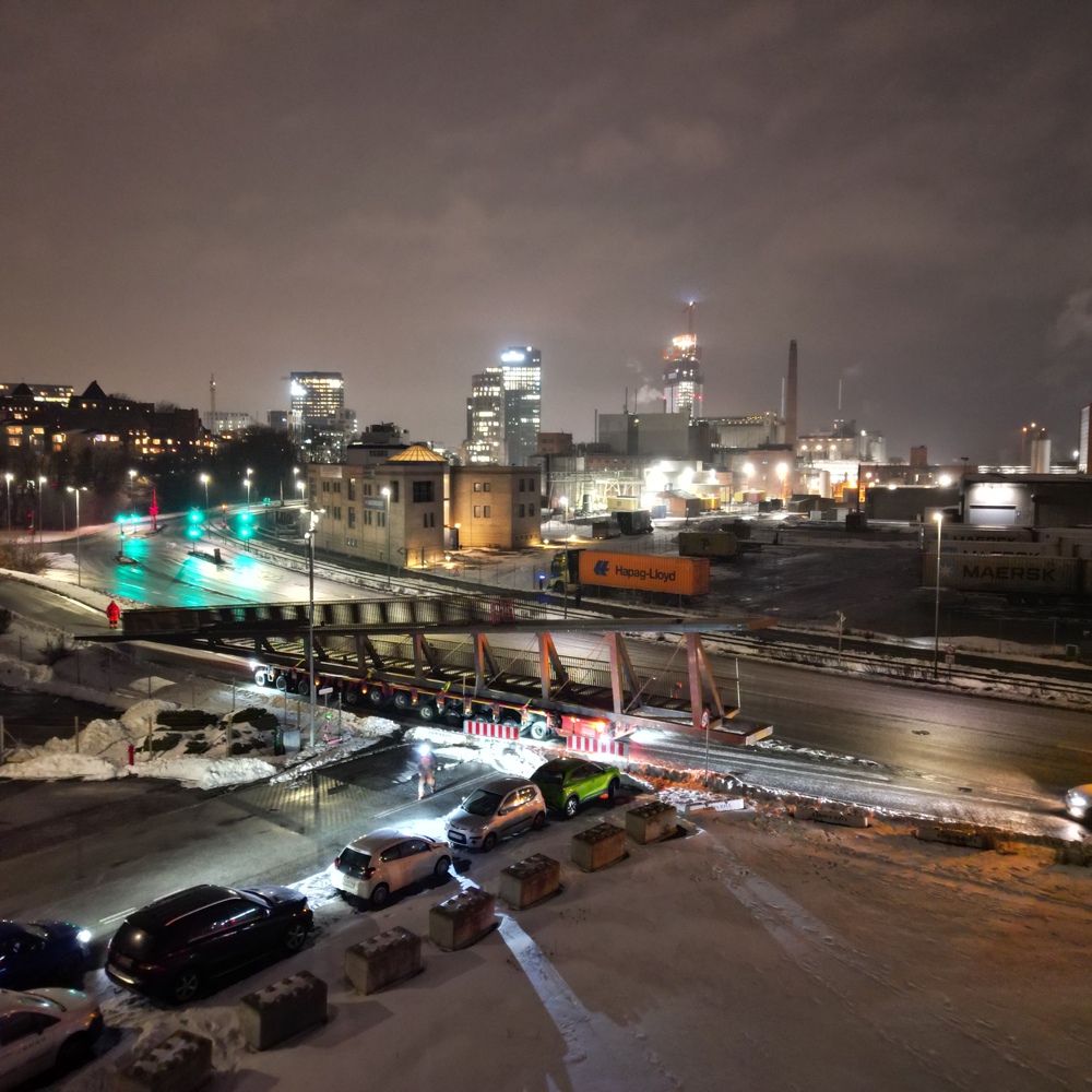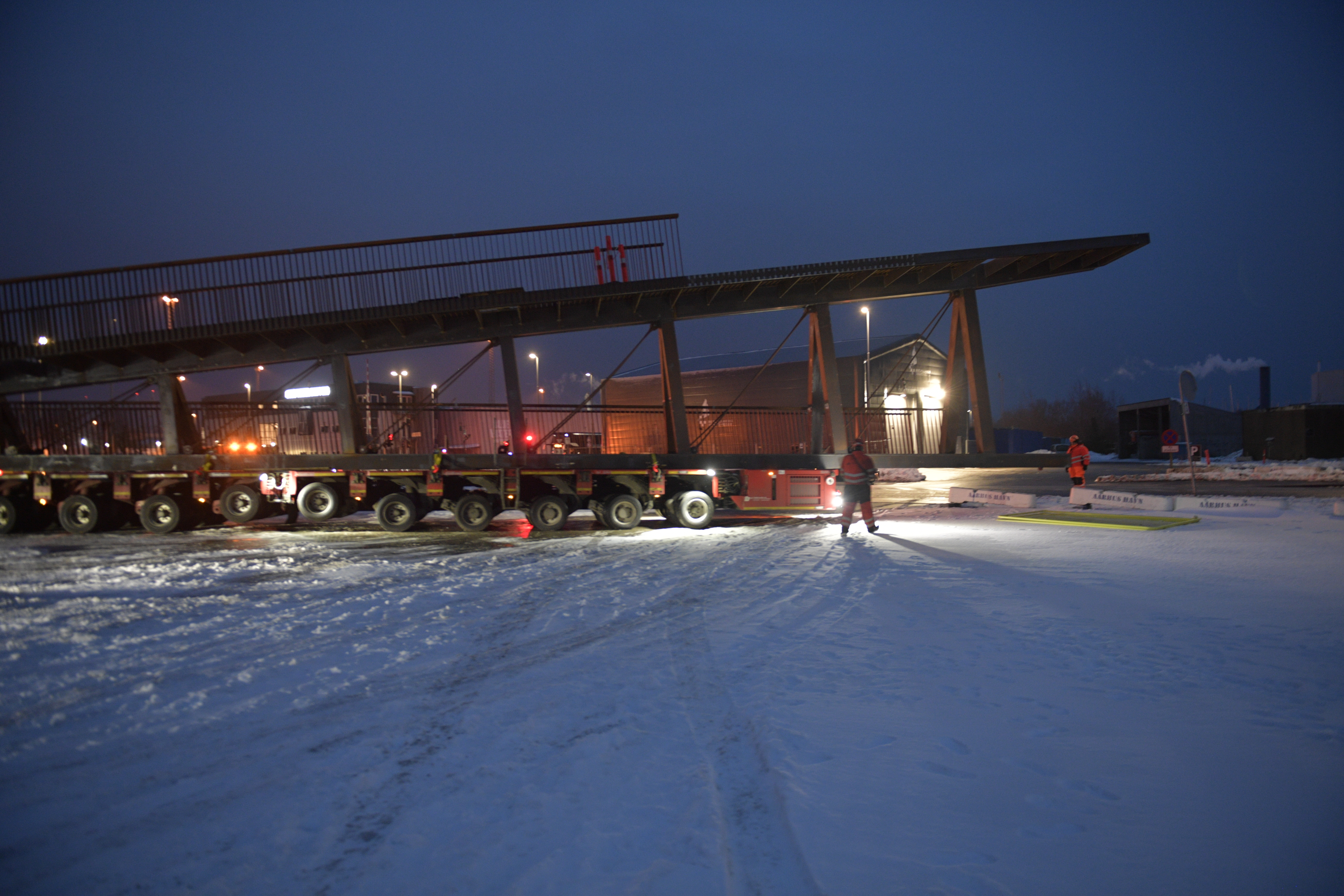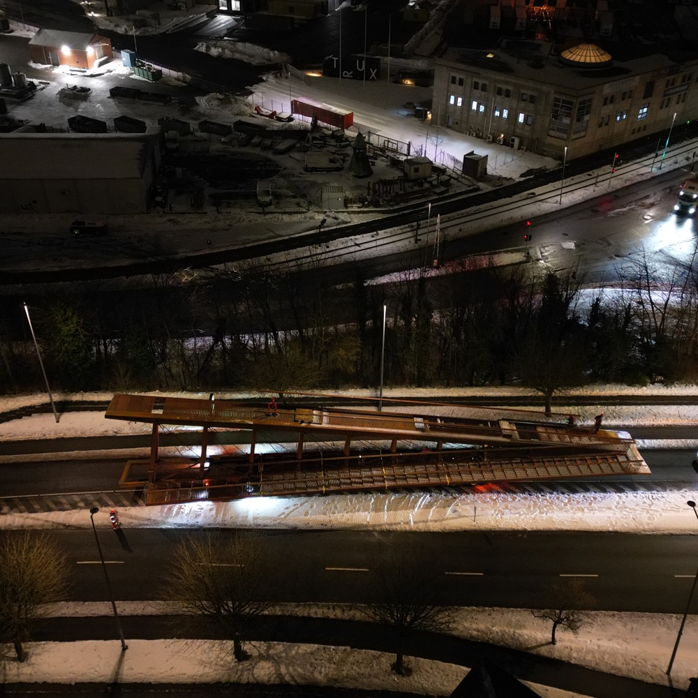 Brosektionen blev transporteret på SPMT af Torben Rafn. Med flere følgebiler og grundig koordinering blev den manøvreret sikkert frem til montageområdet midt i byen.
