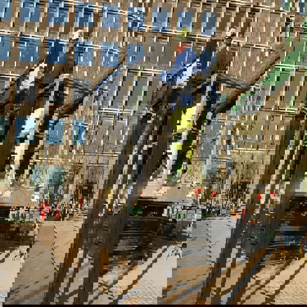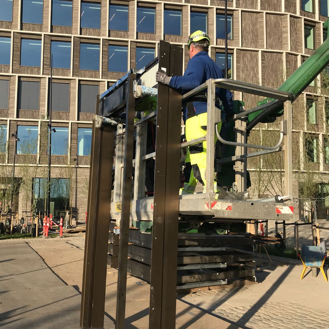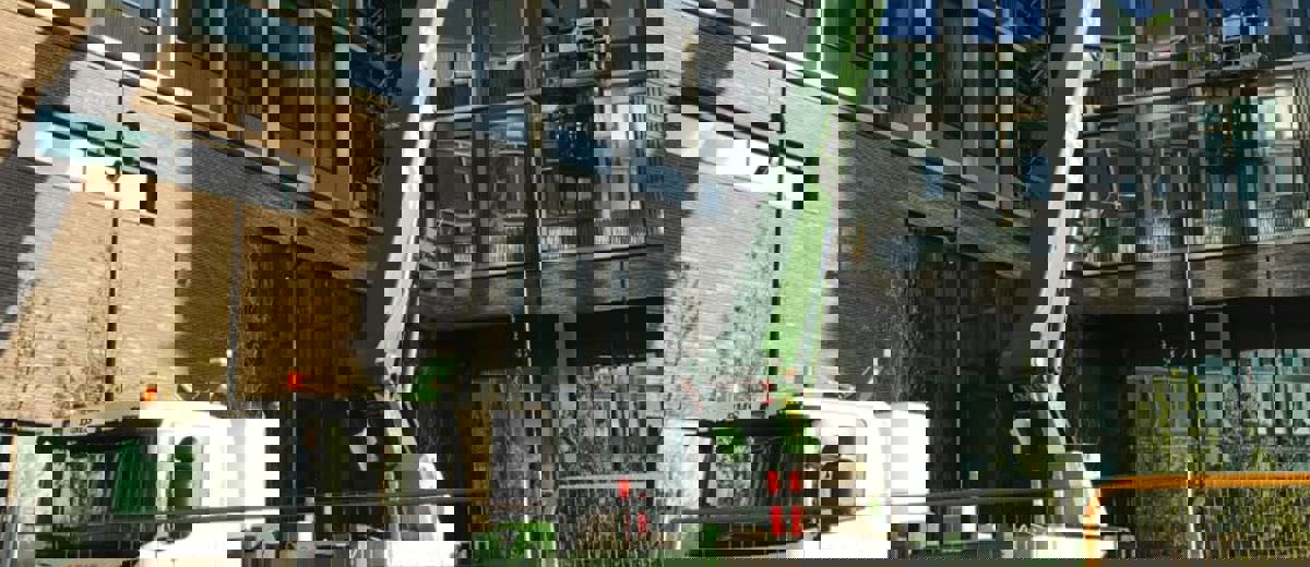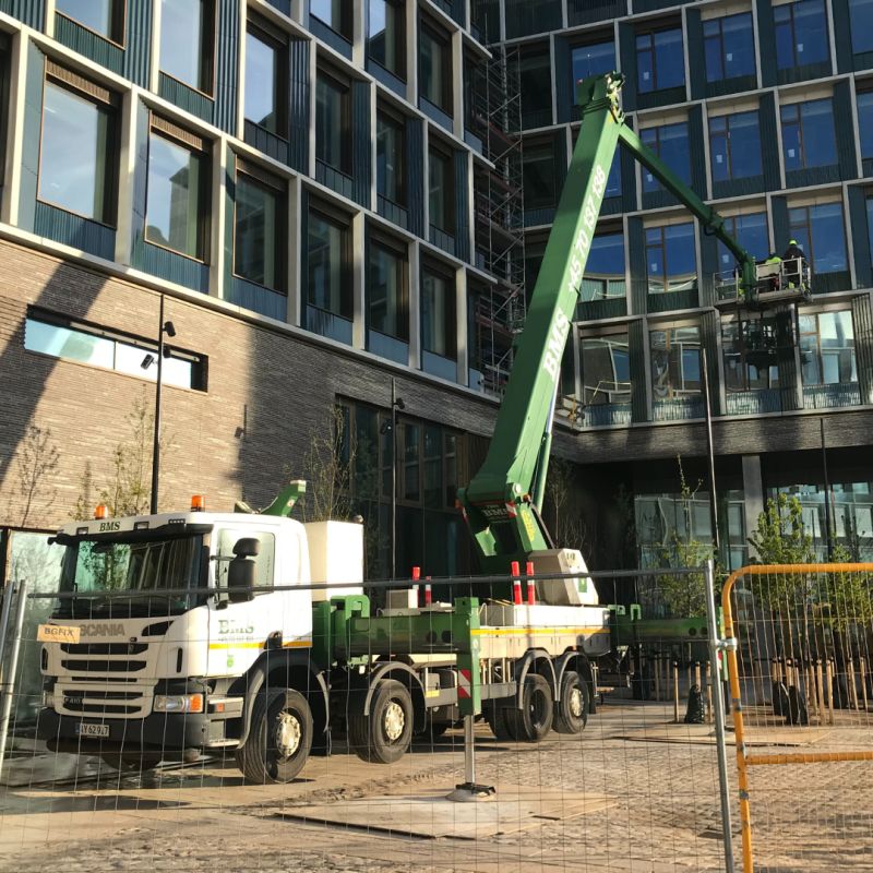 Da vi på Sundkrogsgade skulle løfte faldgitter-rammer med én af vores lastbillifte, var det afgørende, at vores chauffør Muhidin opererede med ekstra stor præcision på alle parametre, da vores lastbillift holdt ovenpå en parkeringskælder. Støttebenene skulle dermed placeres nøje ovenpå de bærende bjælker, inden vi kunne løfte rammerne direkte fra vores kurv i de CE godkendte løftebeslag.