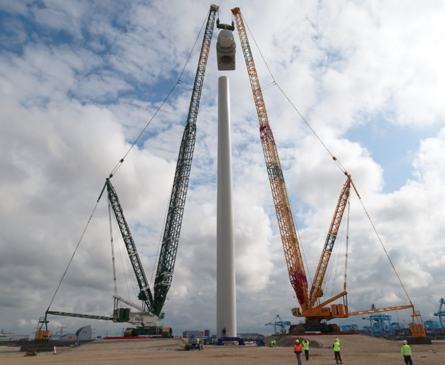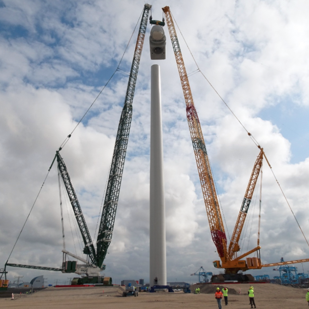 Til installationen af verdens største vindmølle på en testplads i Rotterdams havn udførte BMS Heavy Cranes løfteopgaven med to Liebherr LR11350 kraner i tandem i efteråret 2019.