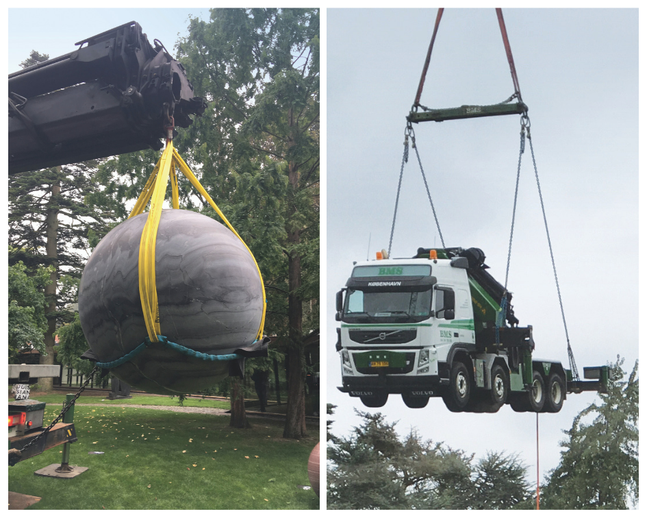 Indledningsvis tilriggede BMS København en 500 ton mobilkran med 165 ton ballast og 49 meter vip. Derefter blev der lagt otte køreplader ud i parken – og til slut blev en 110 ton-meter lastbilkran med en vægt på 26 ton og en rækkevidde på 50 meter løftet på plads. Lastbilkranen havde derefter til opgave at bringe yderligere 30 køreplader på plads, så det var muligt at køre længere ind i parken. Da disse forberedelser var gennemført, løftede mobilkranen de otte sfærer over på lastbilkranen, der så kunne transportere dem til deres bestemmelsessted.