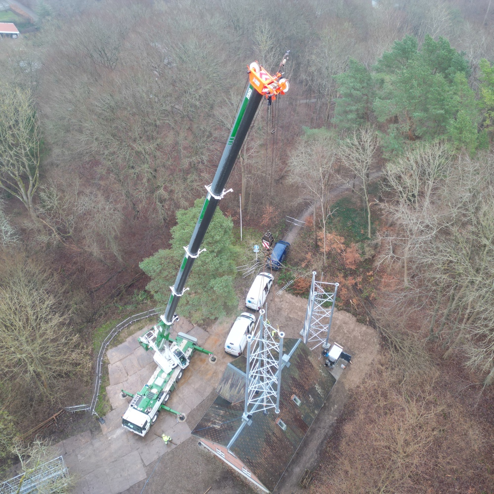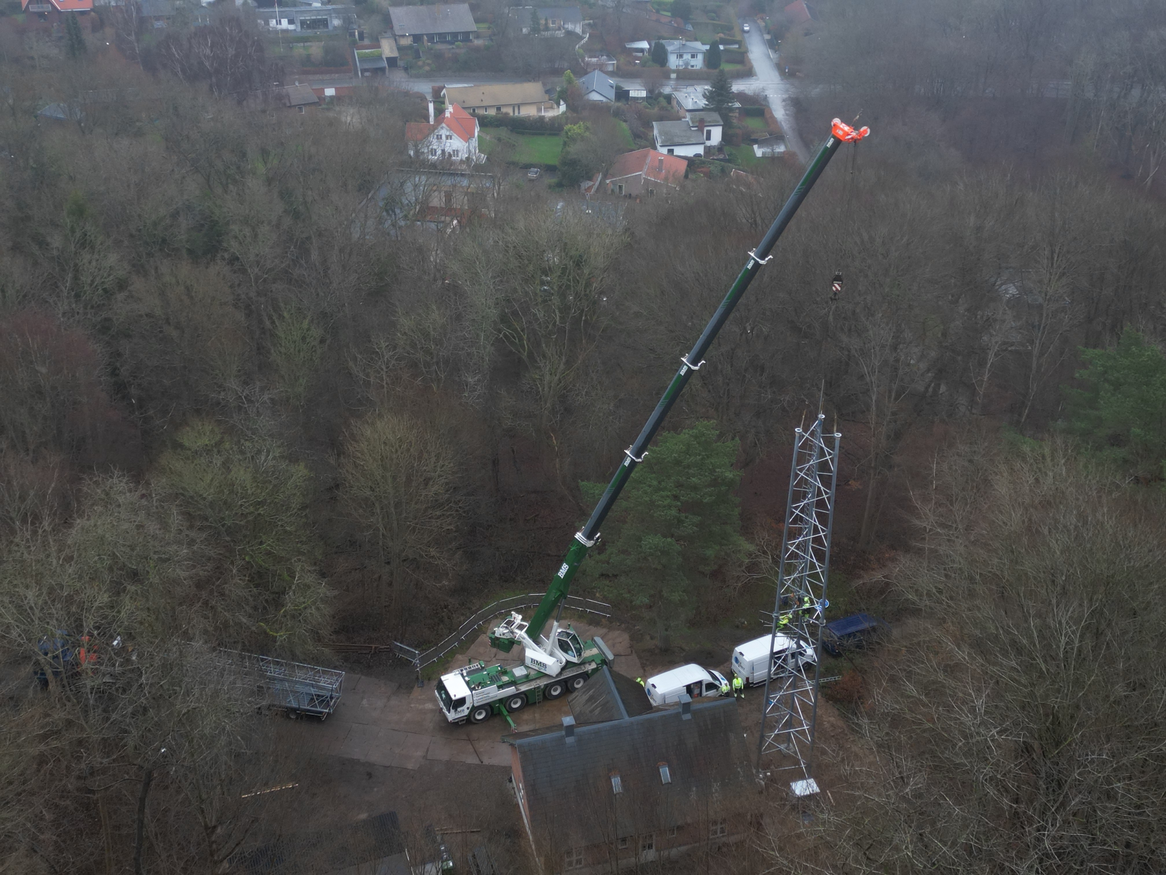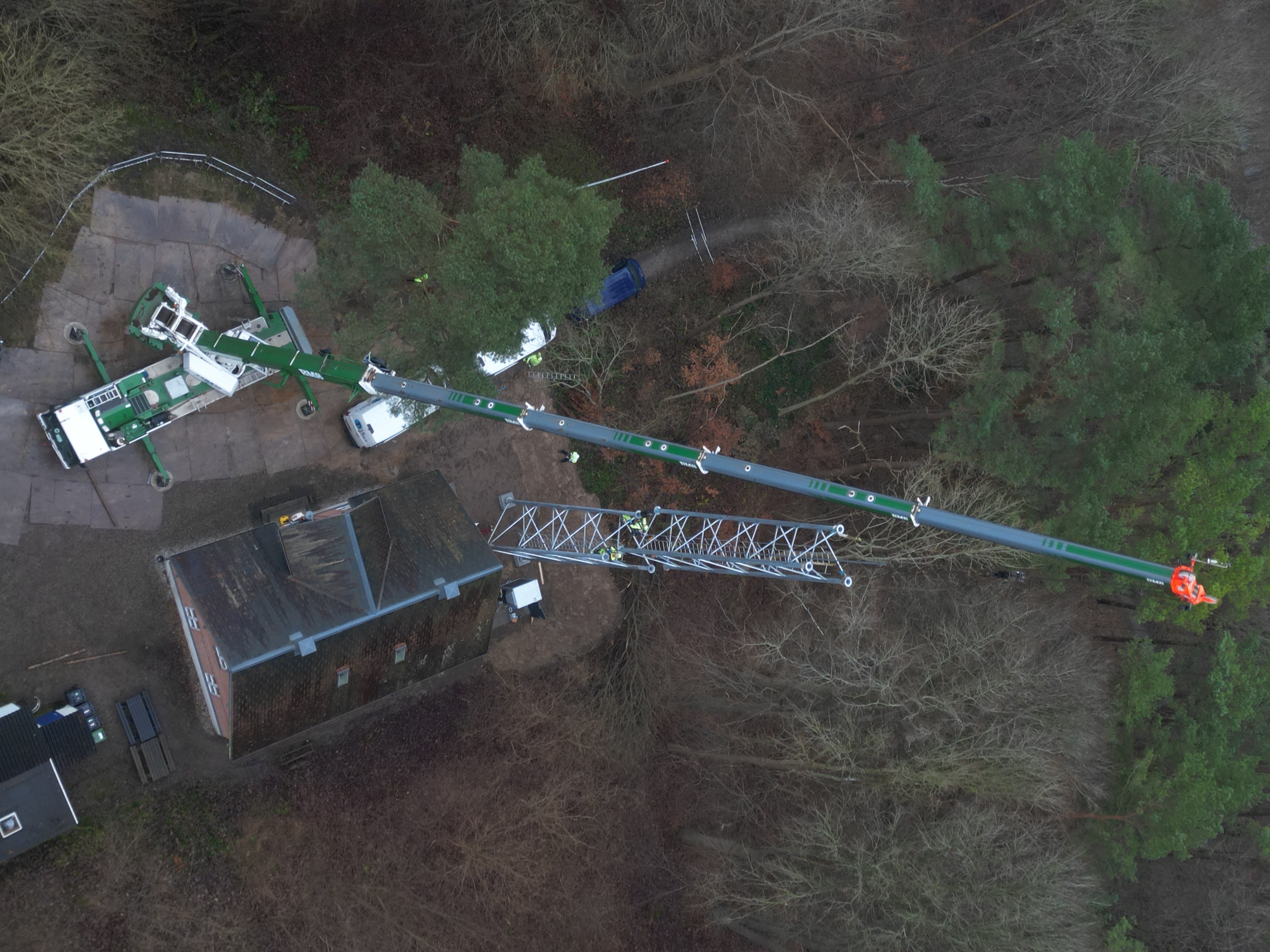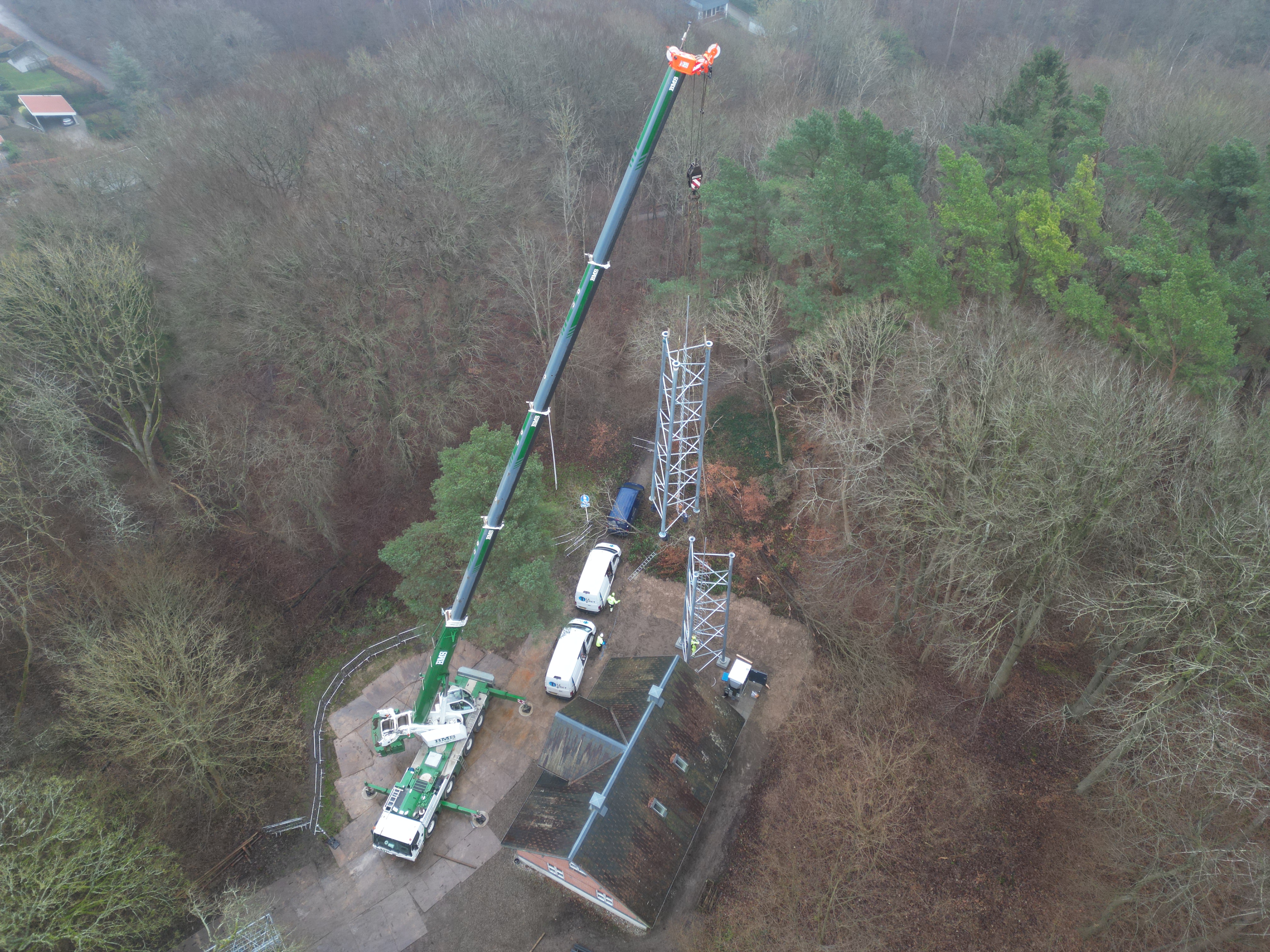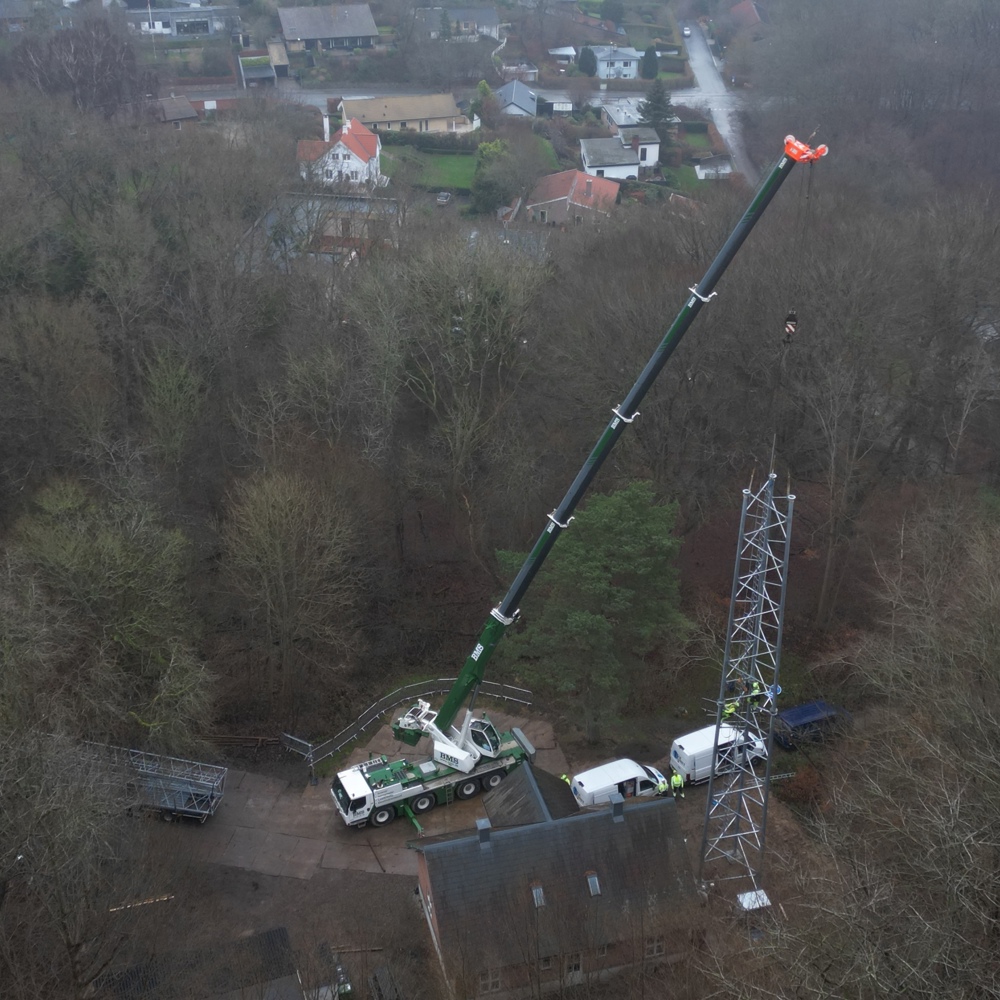Hejst af telemast på et site med meget sparsomt plads i en mindre fredet skov i Højbjerg, hvor vi ikke måtte fælde træerne.