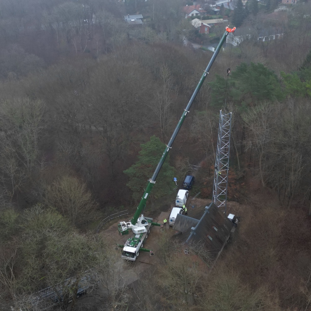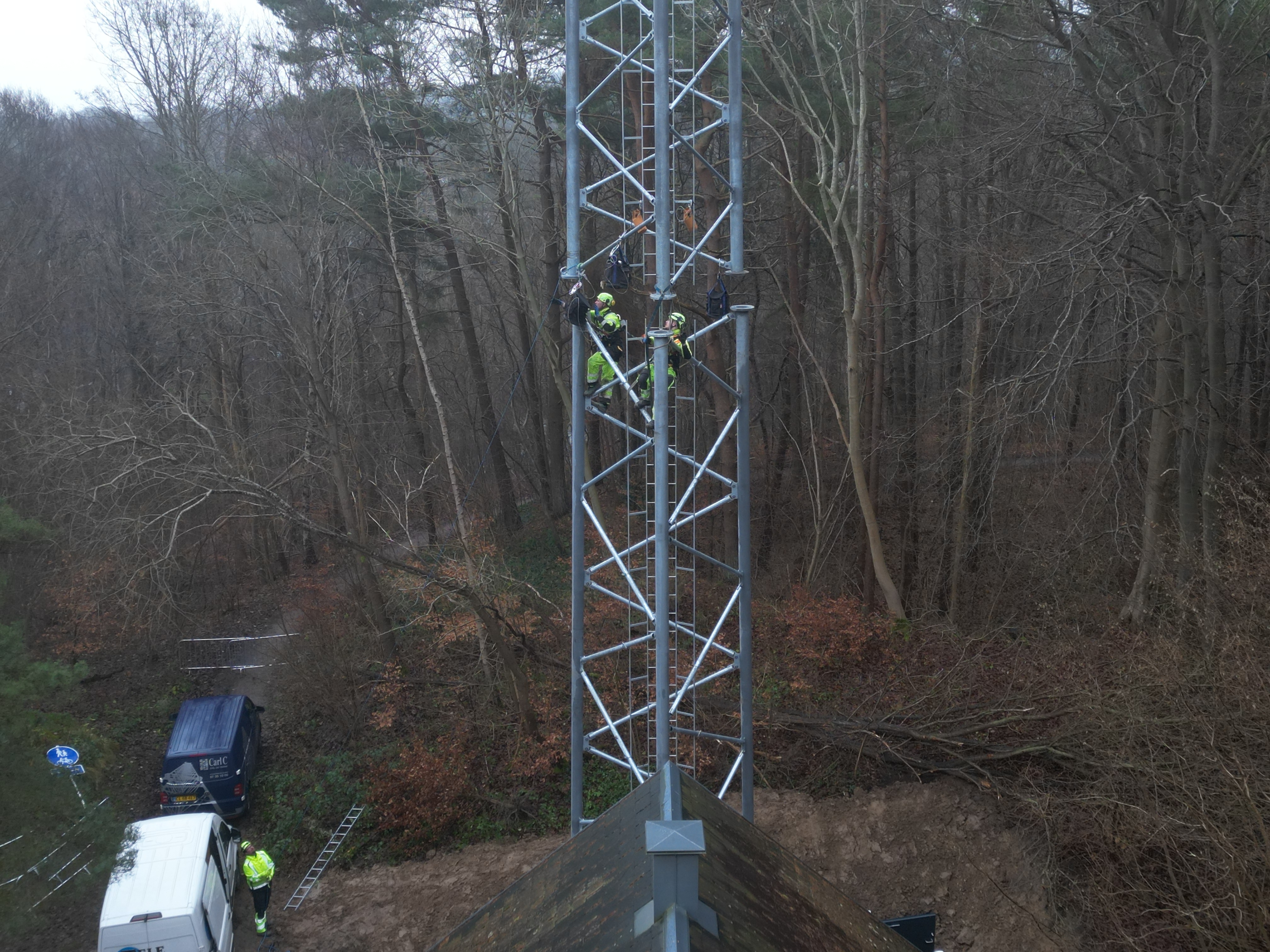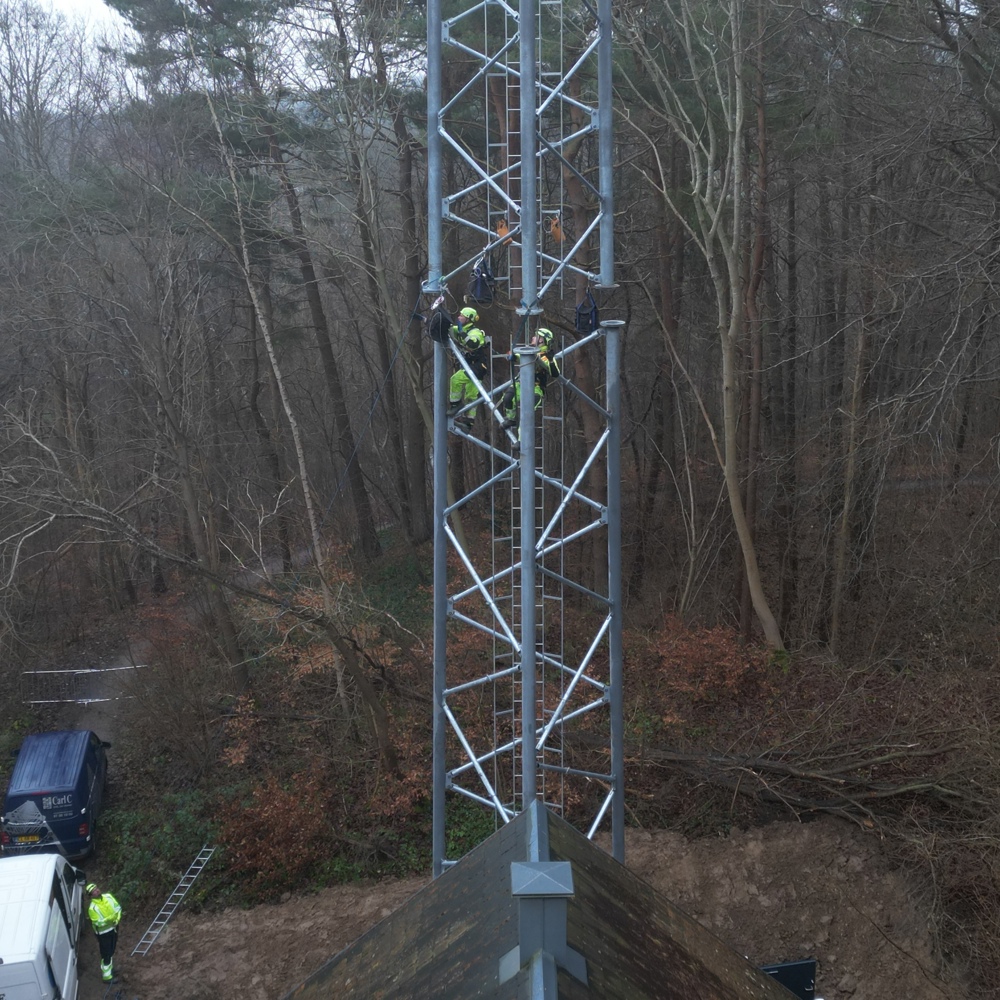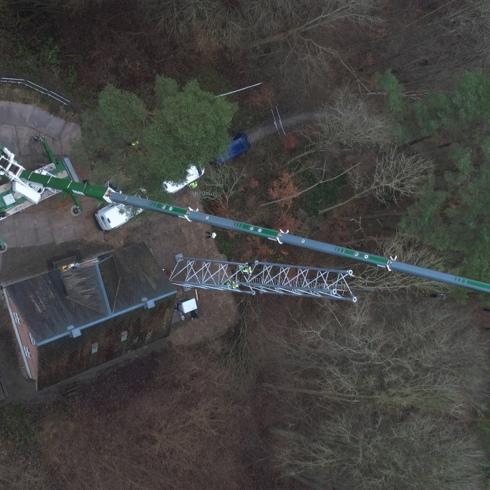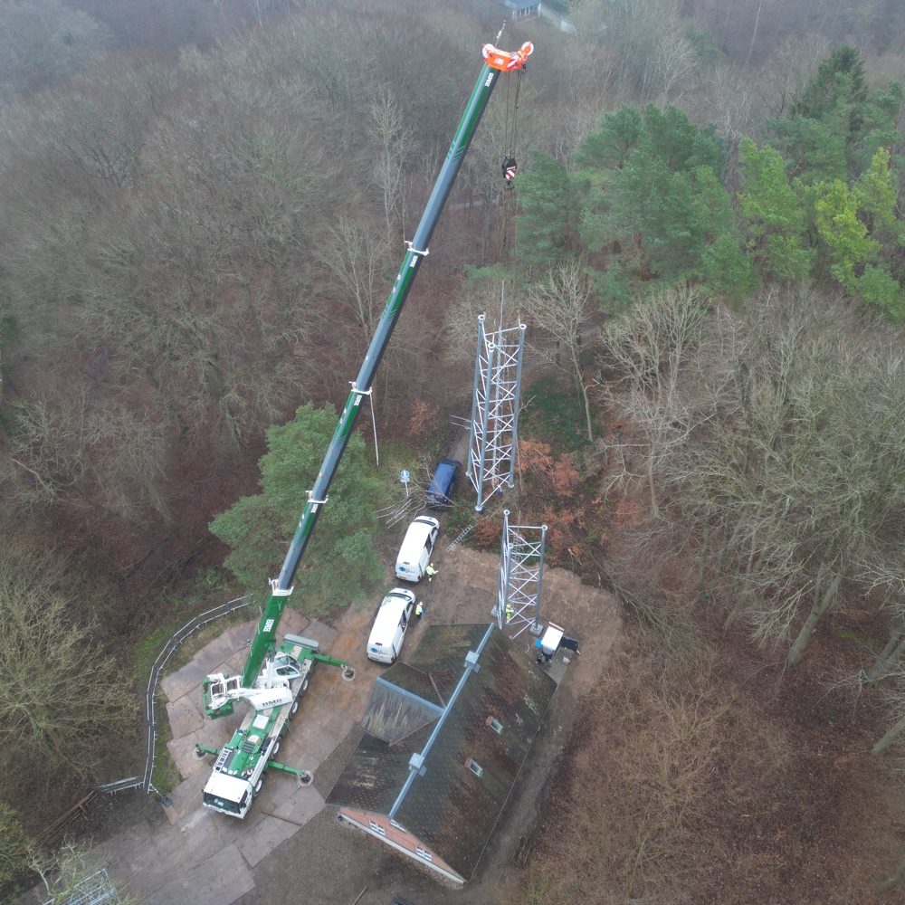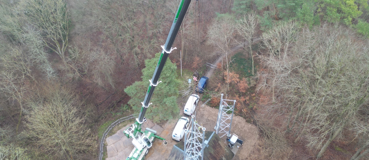 Hejst af telemast på et site med meget sparsomt plads i en mindre fredet skov i Højbjerg, hvor vi ikke måtte fælde træerne.