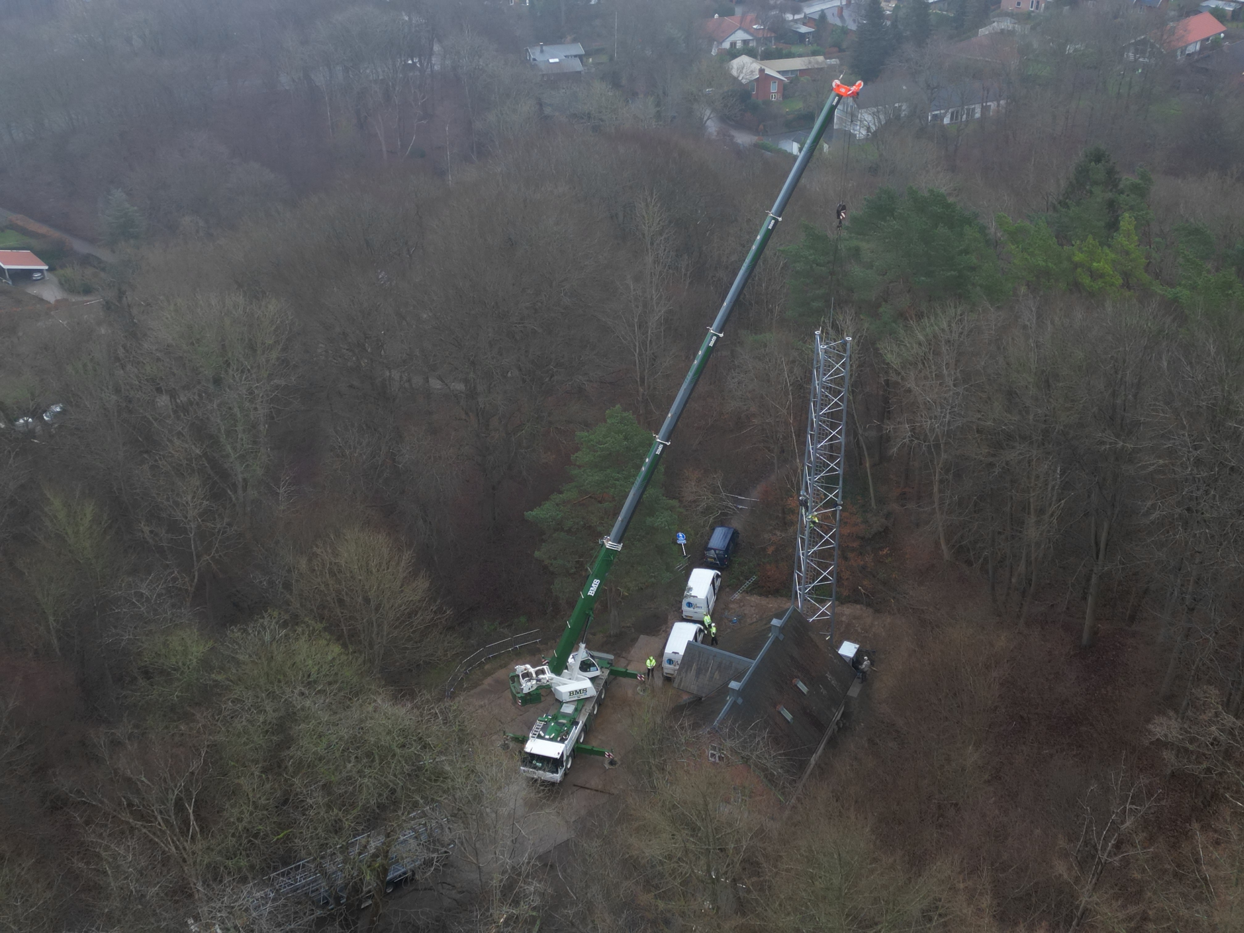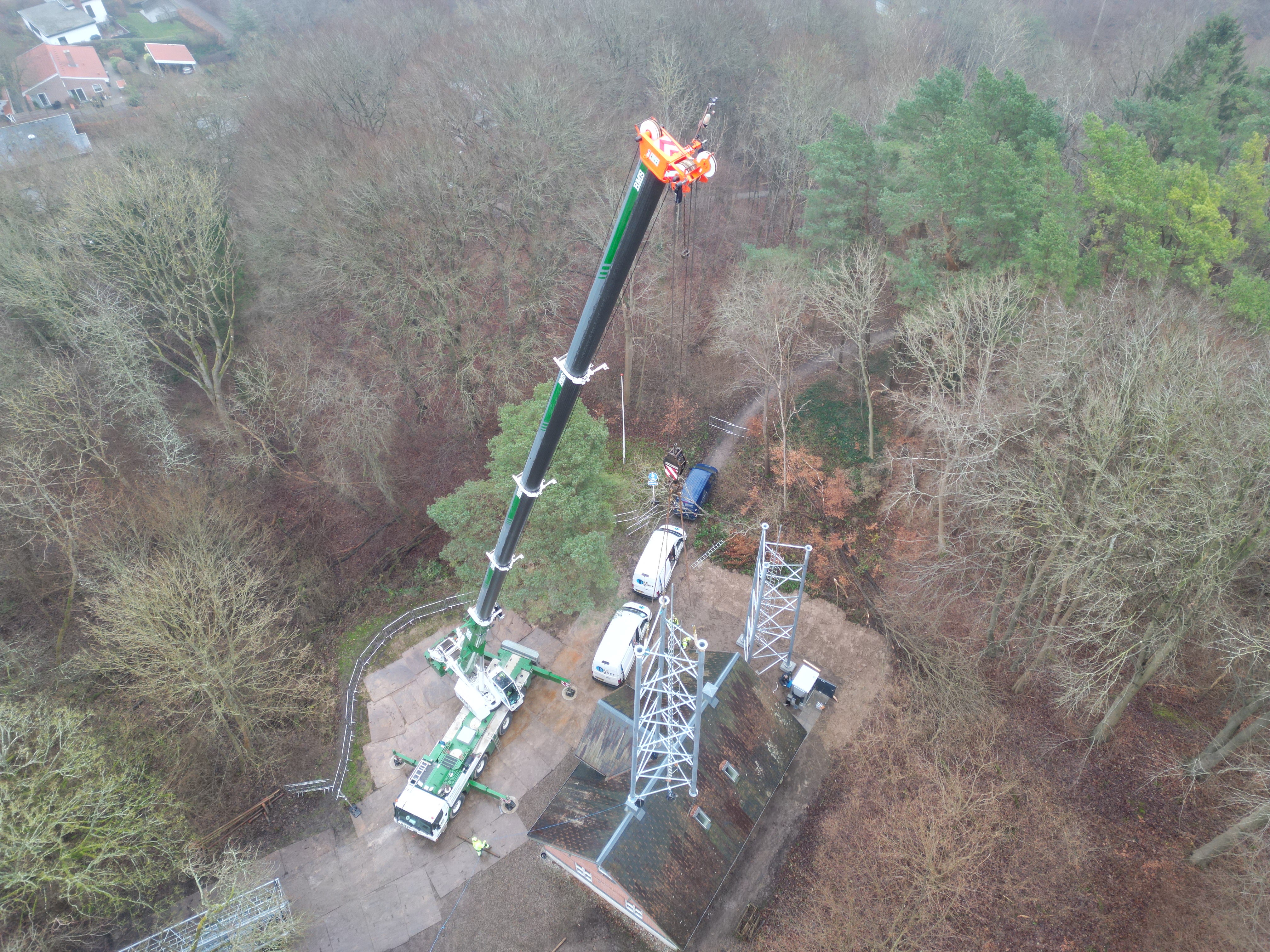En mast på 48 meter i 4 sektioner af 12 meter, ankom på 3 biler med styrbar trailer, som skulle snoges op af den lille skovvej.