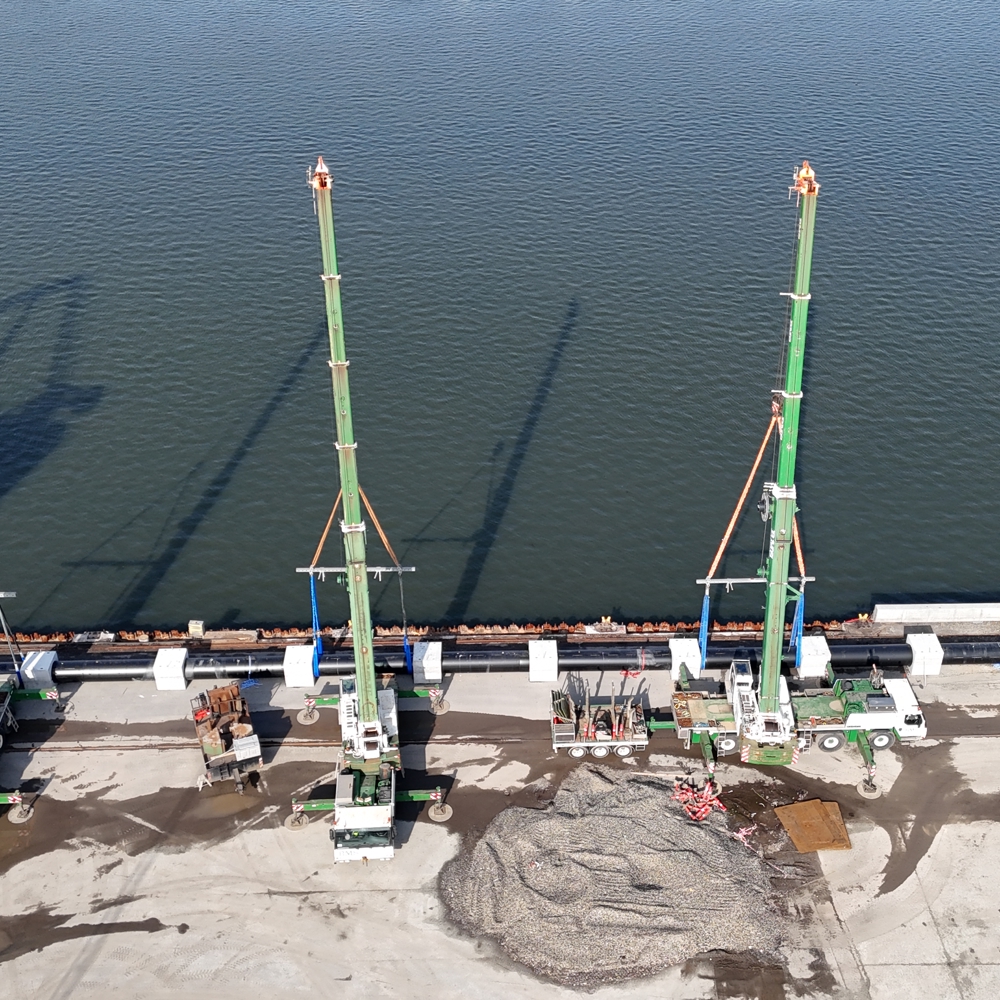 På Kolding Havn blev et 140 meter langt rør løftet på plads i et samløft med seks kraner. Den samlede vægt var 86 ton.