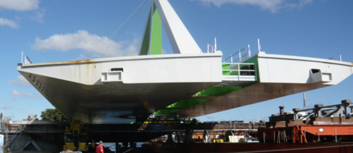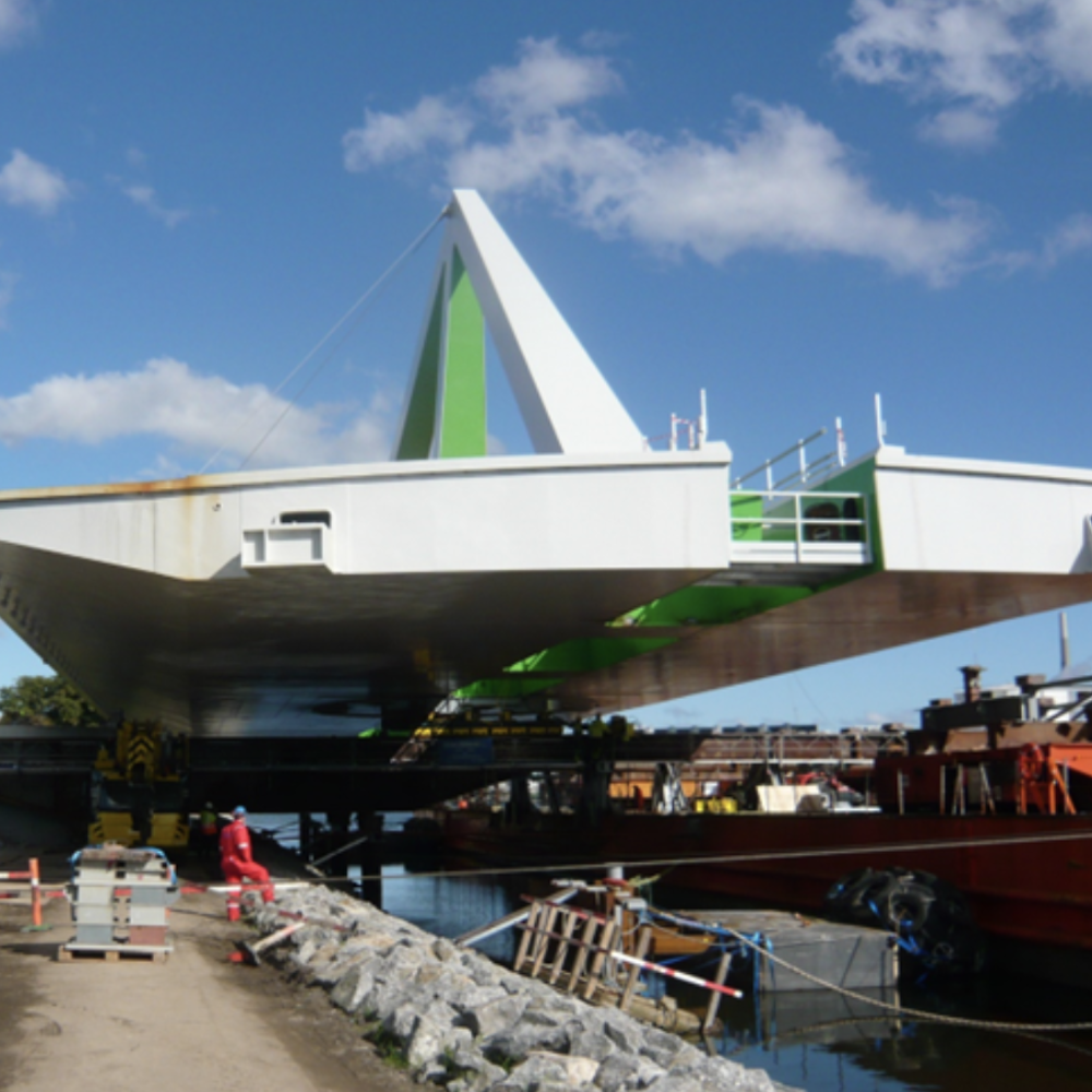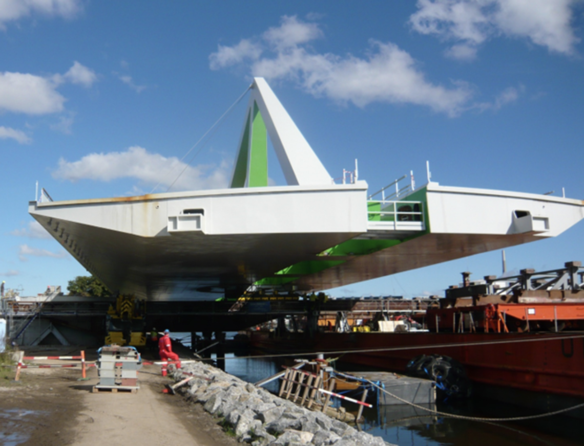 Broen blev skubbet fra pramme ind på land og placeret på fundamenter over et frit spænd på 20 meter.