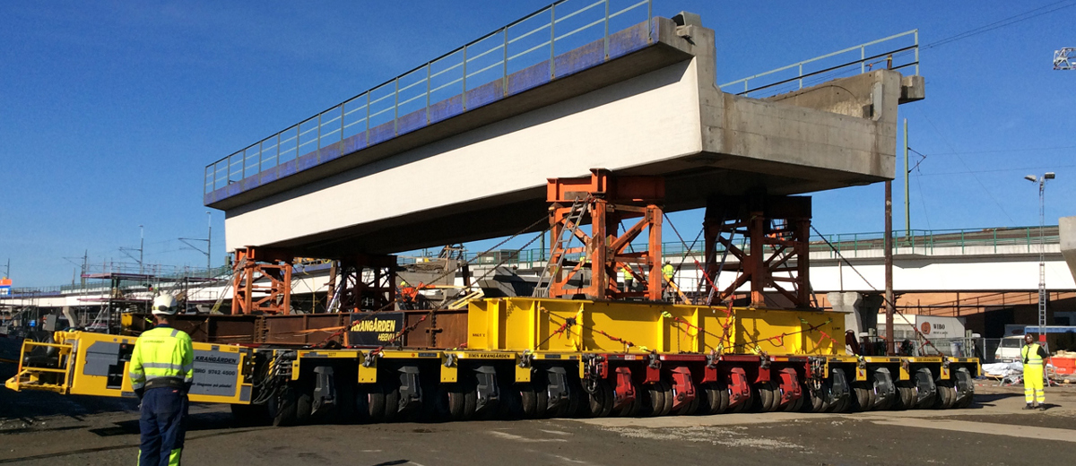 På et andet tidspunkt har BMS Krangården fjernet tre gamle brosektioner ved hjælp af SPMT’er – og den samme metode blev benyttet, da tre nye sektioner præfabrikeret på stedet skulle bringes på plads. Den tungeste af de tre sektioner vejede 650 tons.