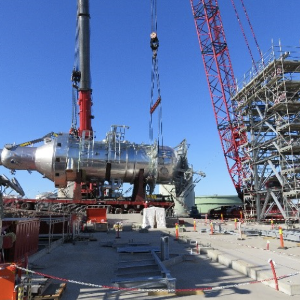 Ved ankomst til installationsområdet blev tårnet rejst og løftet på plads med to store kraner. Også her var pladsforholdene trange med rørføringer og konstruktioner tæt omkring, hvilket igen stillede store krav til forudgående planlægning.