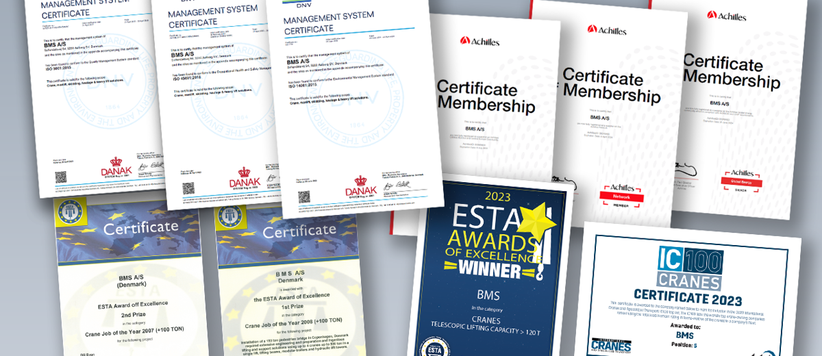 2007 - BMS opnåede en 2.-plads i kategorien “Crane Job of the Year (+100 ton)” for fem kraners løft af en 200 tons brodrager i DR Byen i København, Danmark. Se certifikat: ESTA Award - 2nd prize 2007.