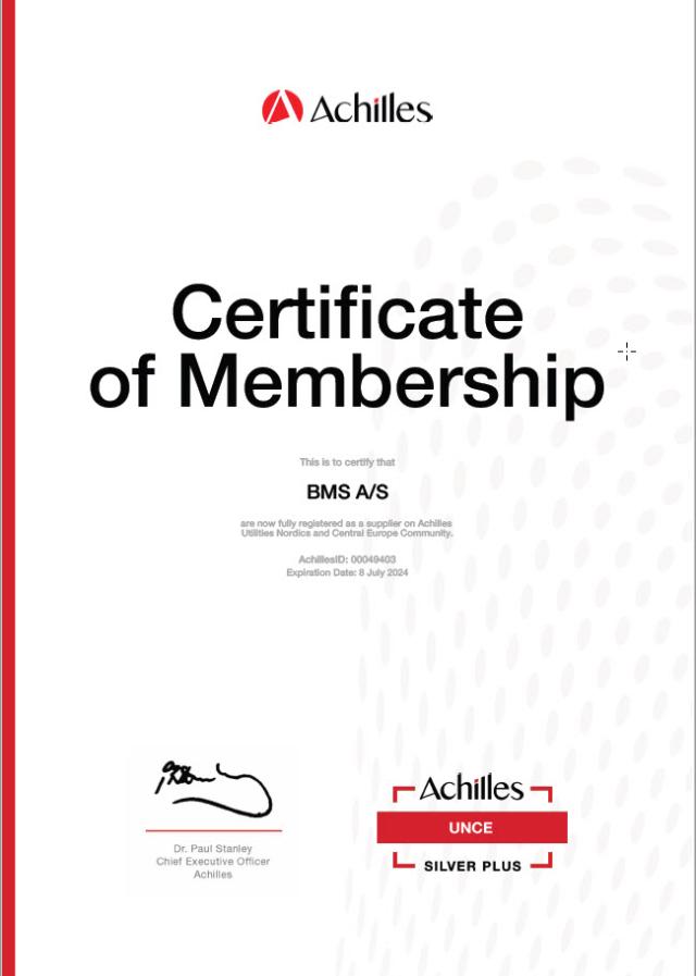 BMS er certificeret som leverandør gennem Achilles UVDB og er dermed godkendt til at levere serviceydelser til forsyningssektoren i Storbritannien.