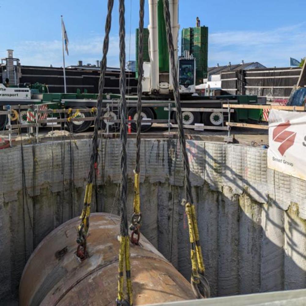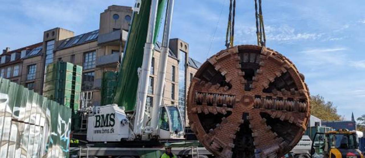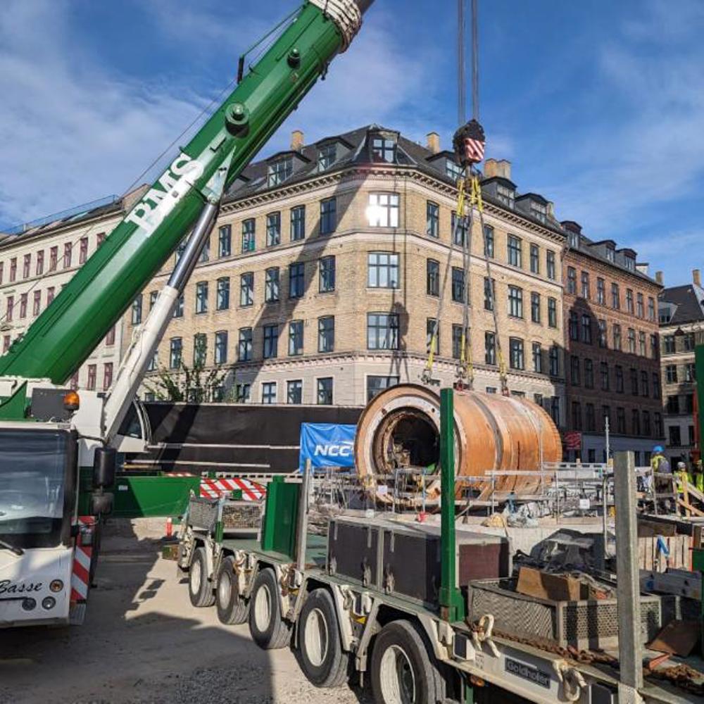 Efter flere måneders arbejde under jorden, så tunnelboremaskinen Sigrid igen dagens lys, da “Basse” - vores 450 TS Liebherr mobilkran - hejste den 113-tons tunge tunnelboremaskine op gennem Halmtorvet